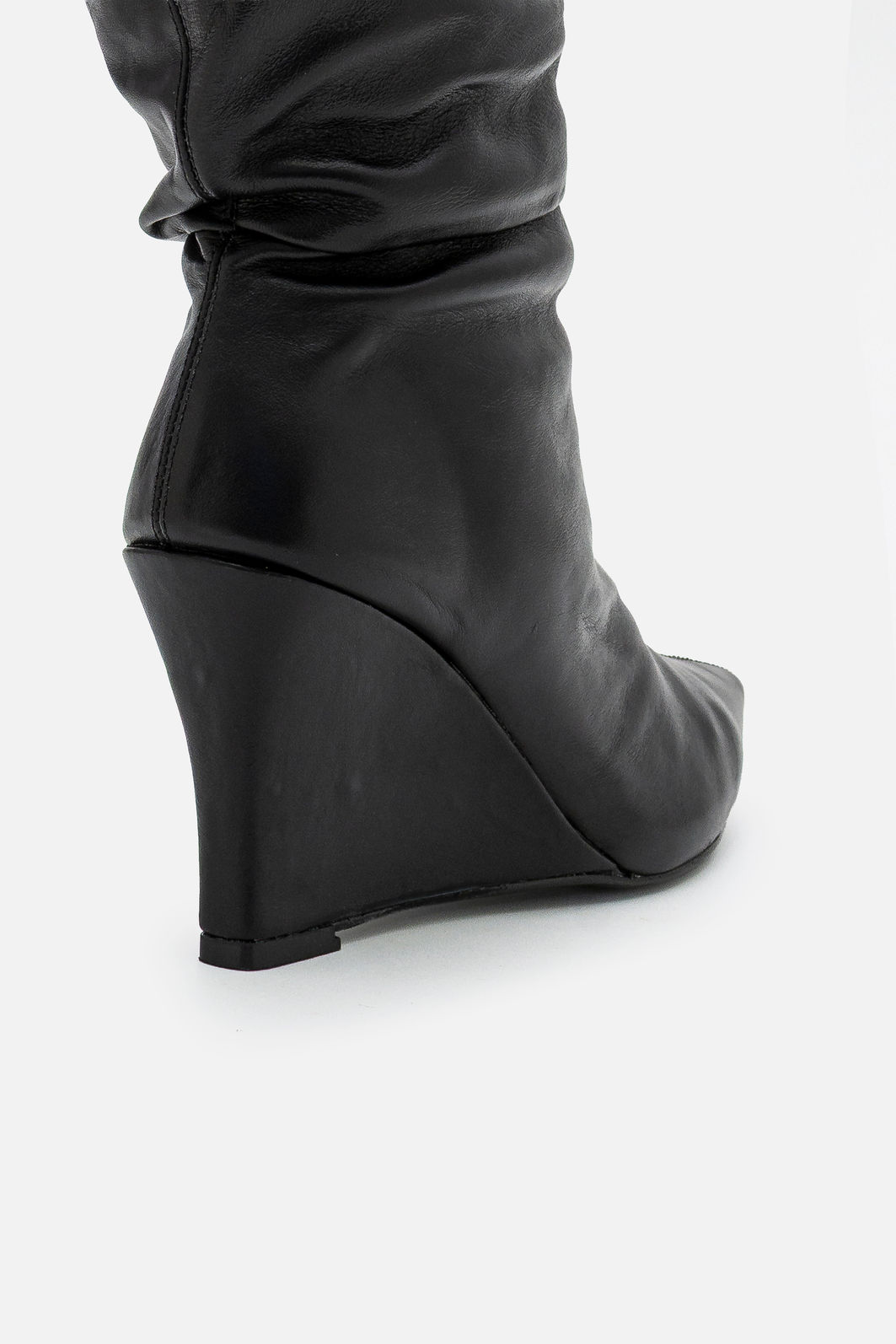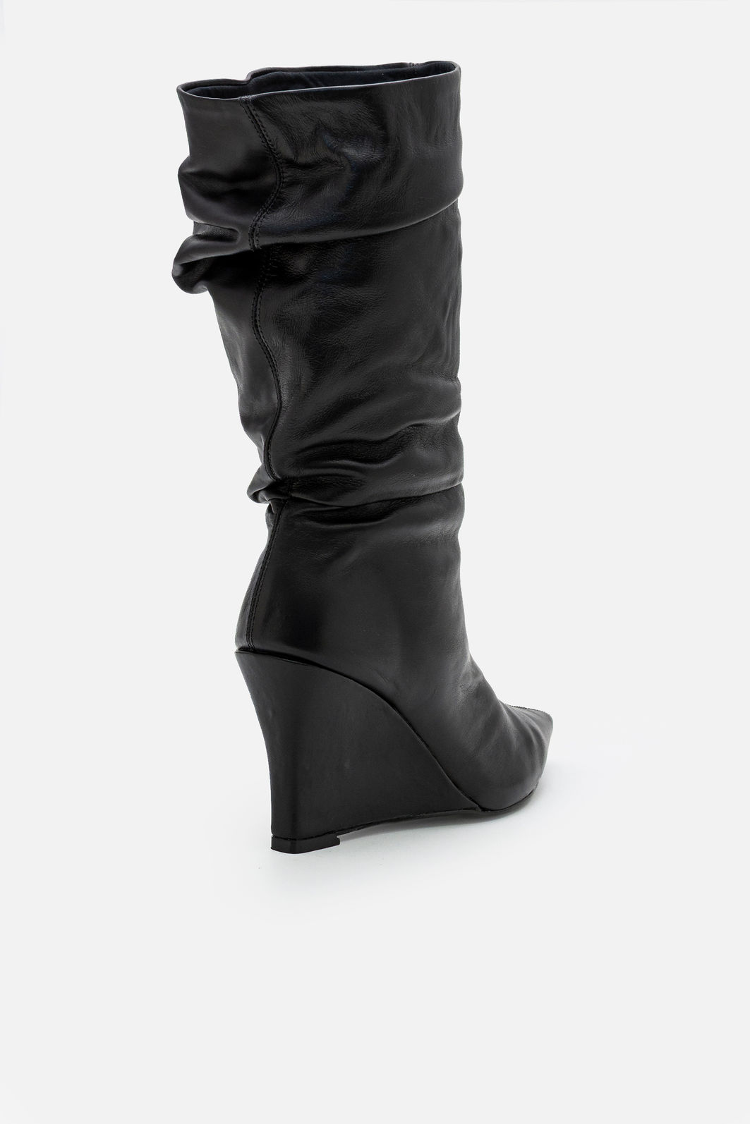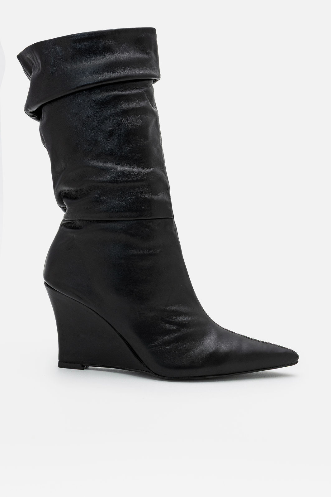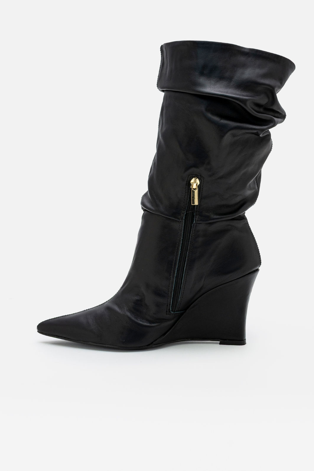 Confeccionada em couro legítimo, apresenta acabamento macio e de alta qualidade, garantindo durabilidade e um toque sofisticado ao visual. O modelo possui bico fino, detalhe que alonga a silhueta e acrescenta elegância ao caminhar. O cano médio com leve drapeado cria um efeito moderno e estiloso, adicionando personalidade ao design.