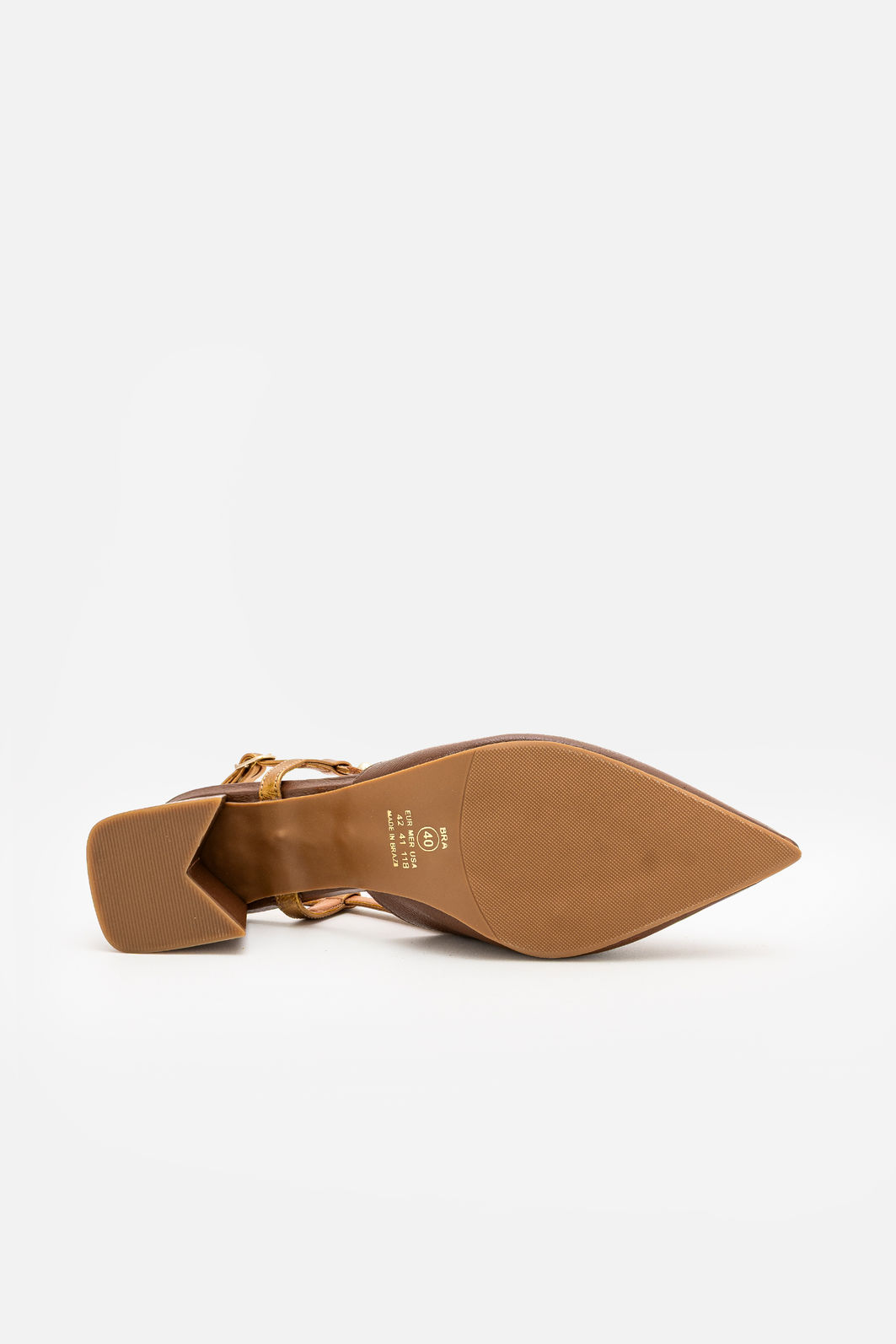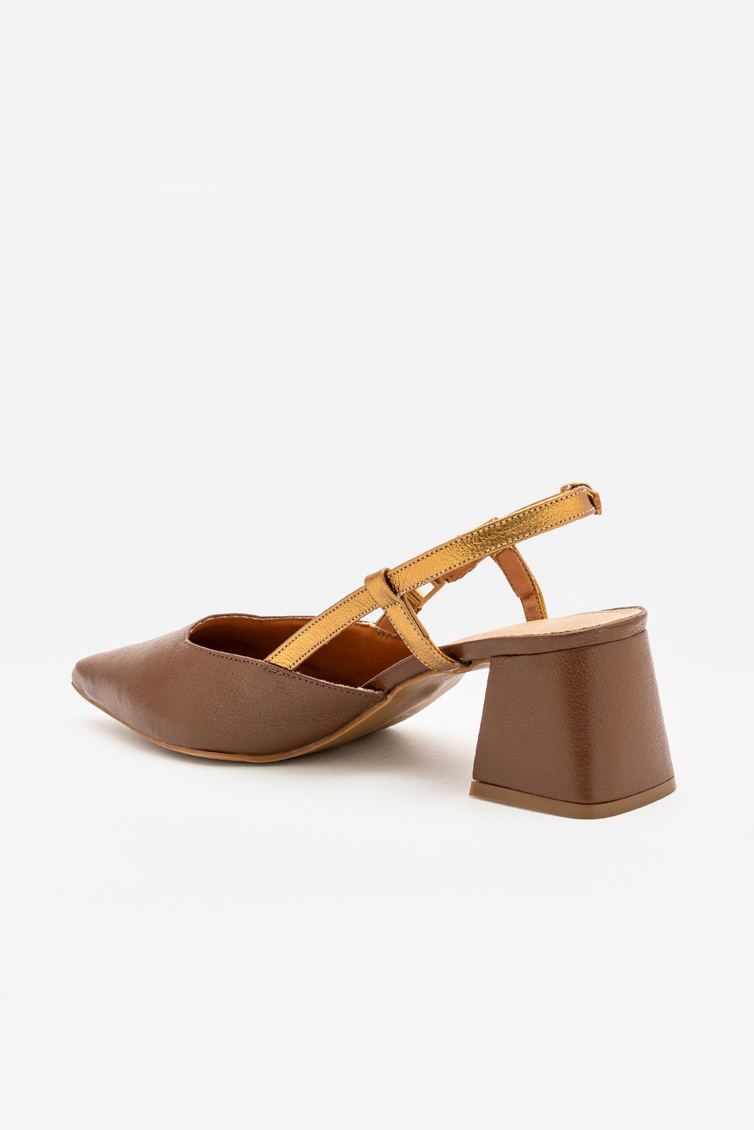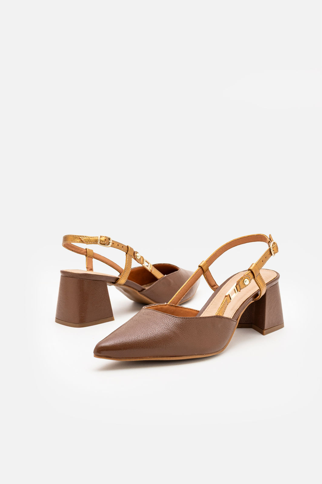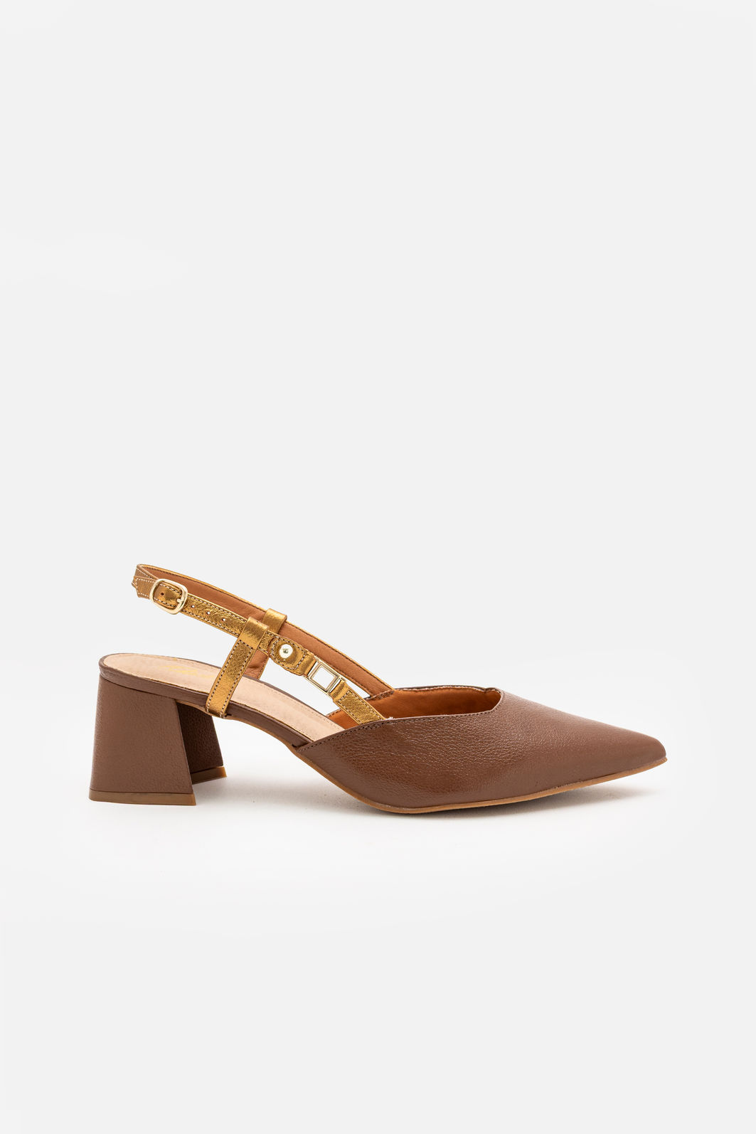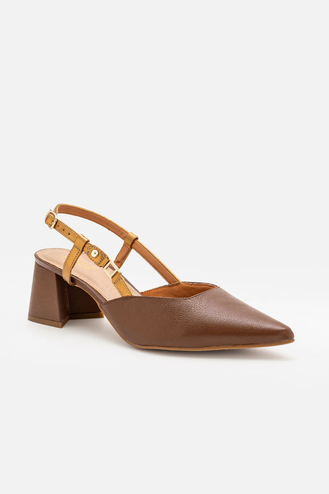 O salto bloco oferece estabilidade superior sem perder a delicadeza, proporcionando segurança ao caminhar e conforto ao longo do dia. A tira traseira ajustável garante encaixe preciso, valorizando o contorno do pé e mantendo o modelo firme durante o uso.