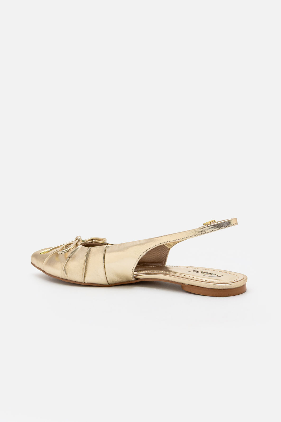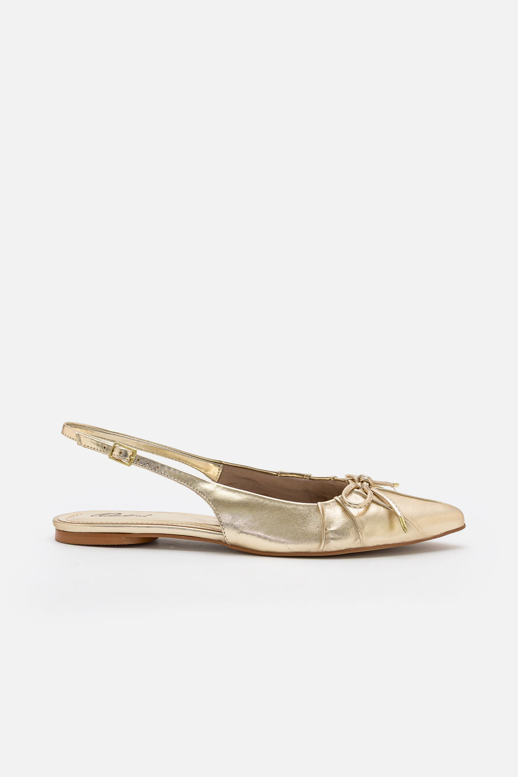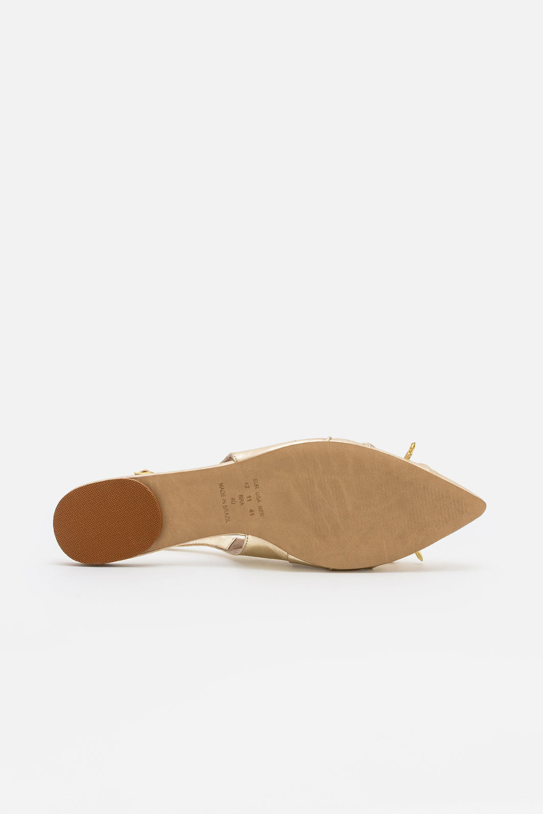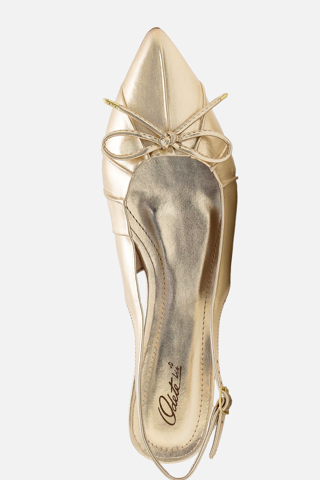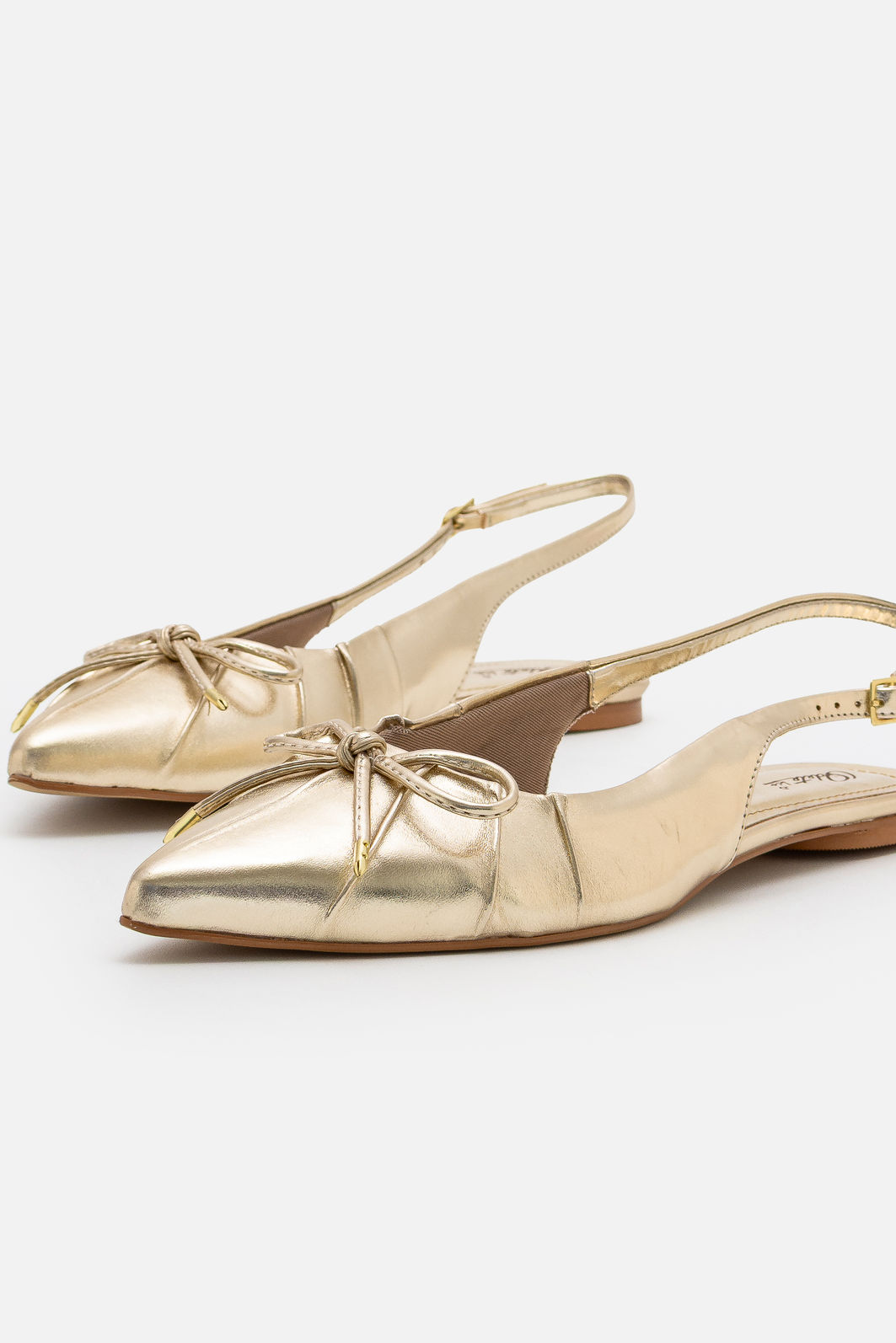 Seu acabamento em verniz metálico realça o tom ouro com um brilho sutil e refinado, enquanto o laço delicado com ponteiras douradas adiciona um toque de feminilidade irresistível. O bico fino alonga a silhueta e valoriza qualquer look, do casual chic ao sofisticado.