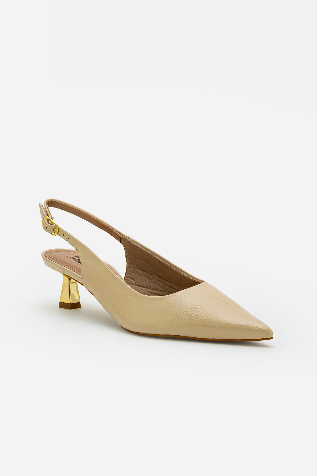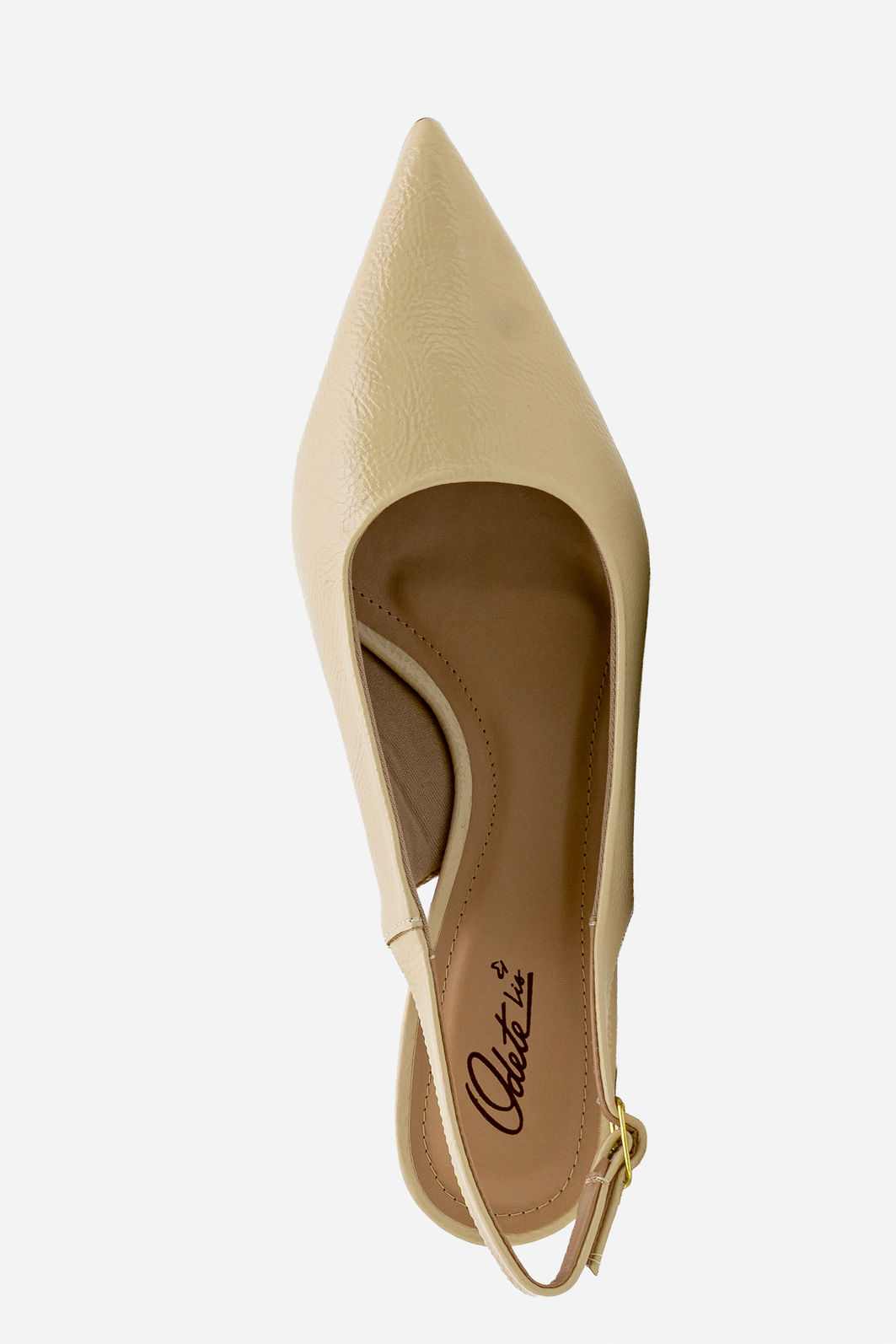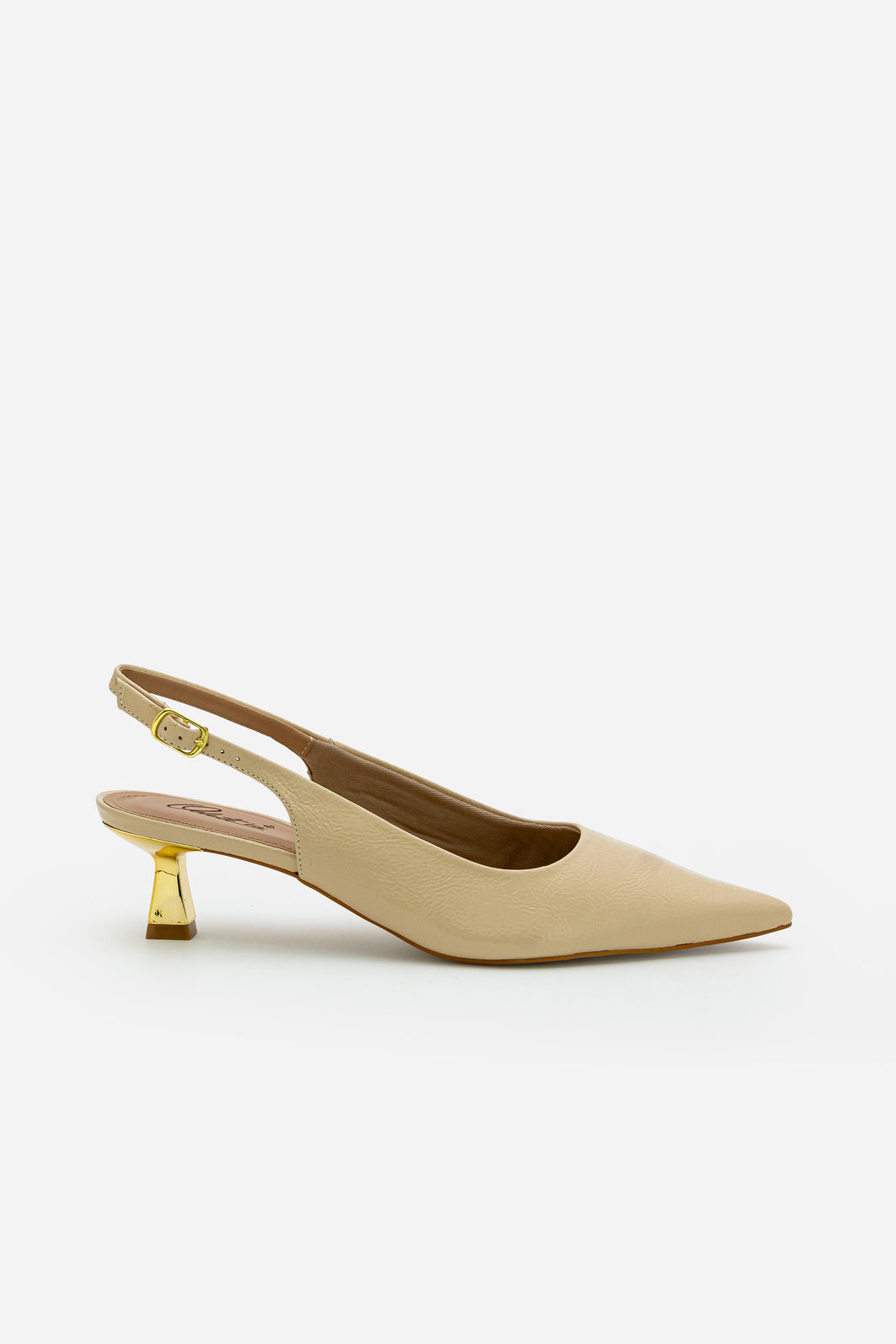 O chanel em verniz amêndoa com salto cromado traduz elegância leve e contemporânea. O acabamento envernizado revela um brilho sutil e sofisticado, enquanto o tom neutro valoriza produções com discrição e refinamento. O bico fino alonga a silhueta e confere um visual delicado e feminino.