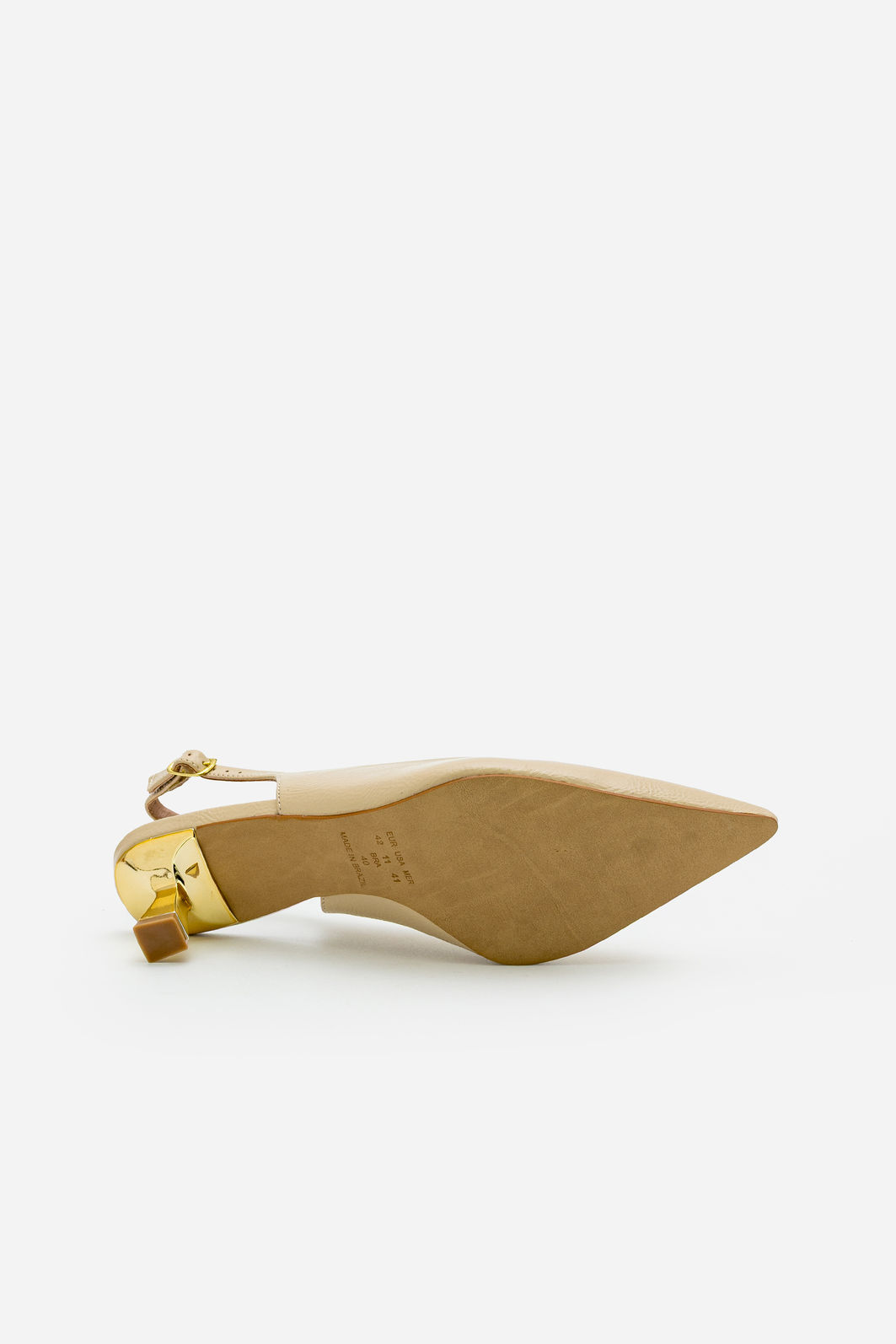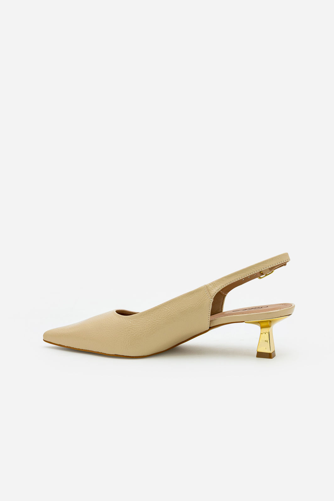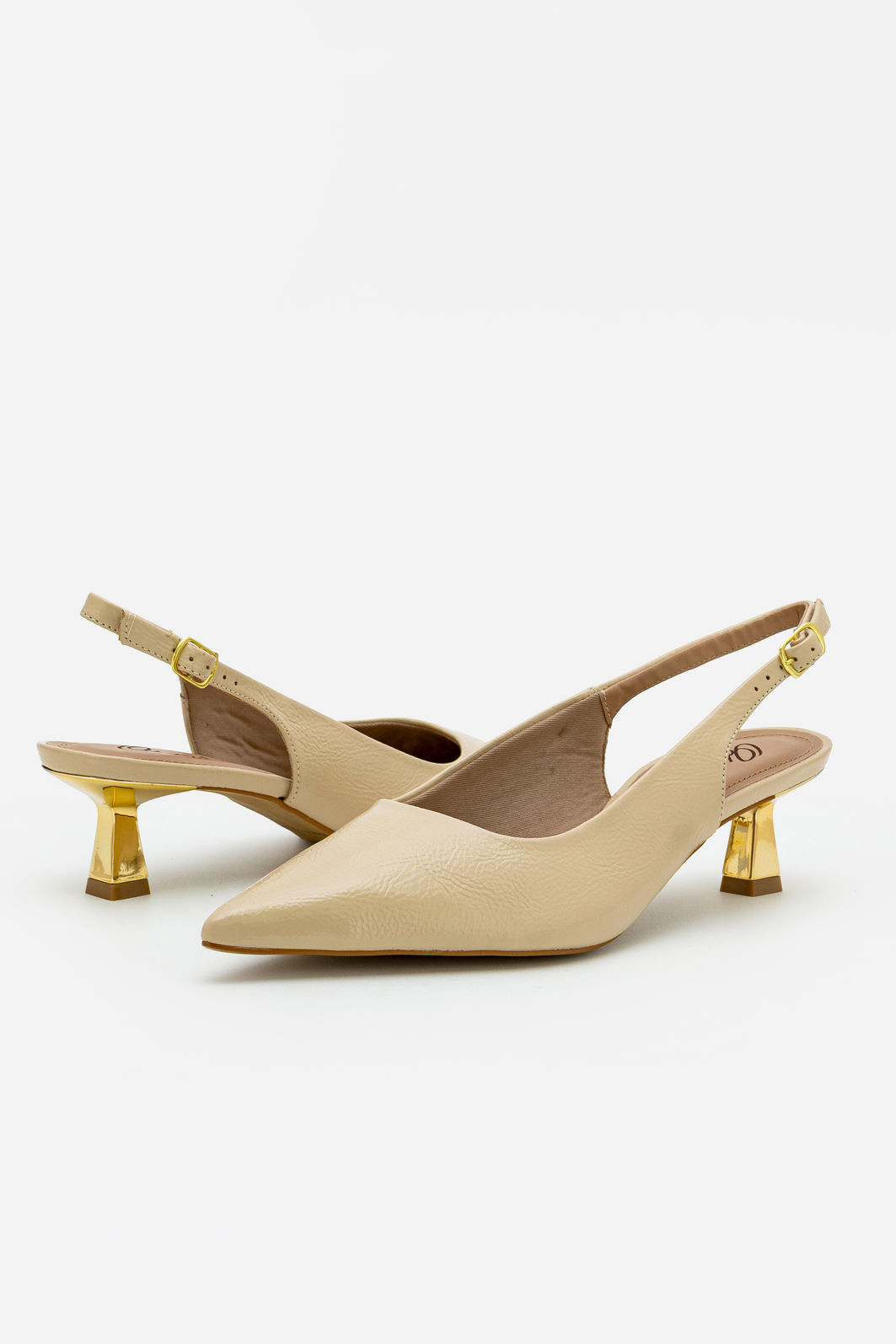 O chanel em verniz amêndoa com salto cromado traduz elegância leve e contemporânea. O acabamento envernizado revela um brilho sutil e sofisticado, enquanto o tom neutro valoriza produções com discrição e refinamento. O bico fino alonga a silhueta e confere um visual delicado e feminino.