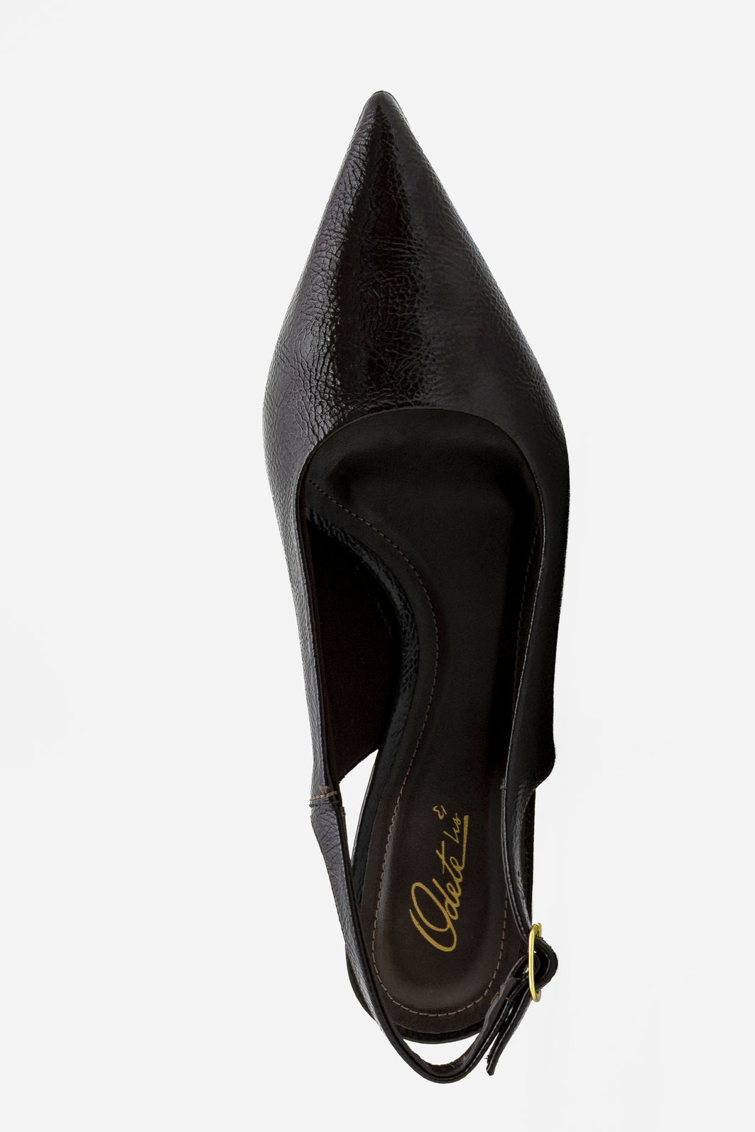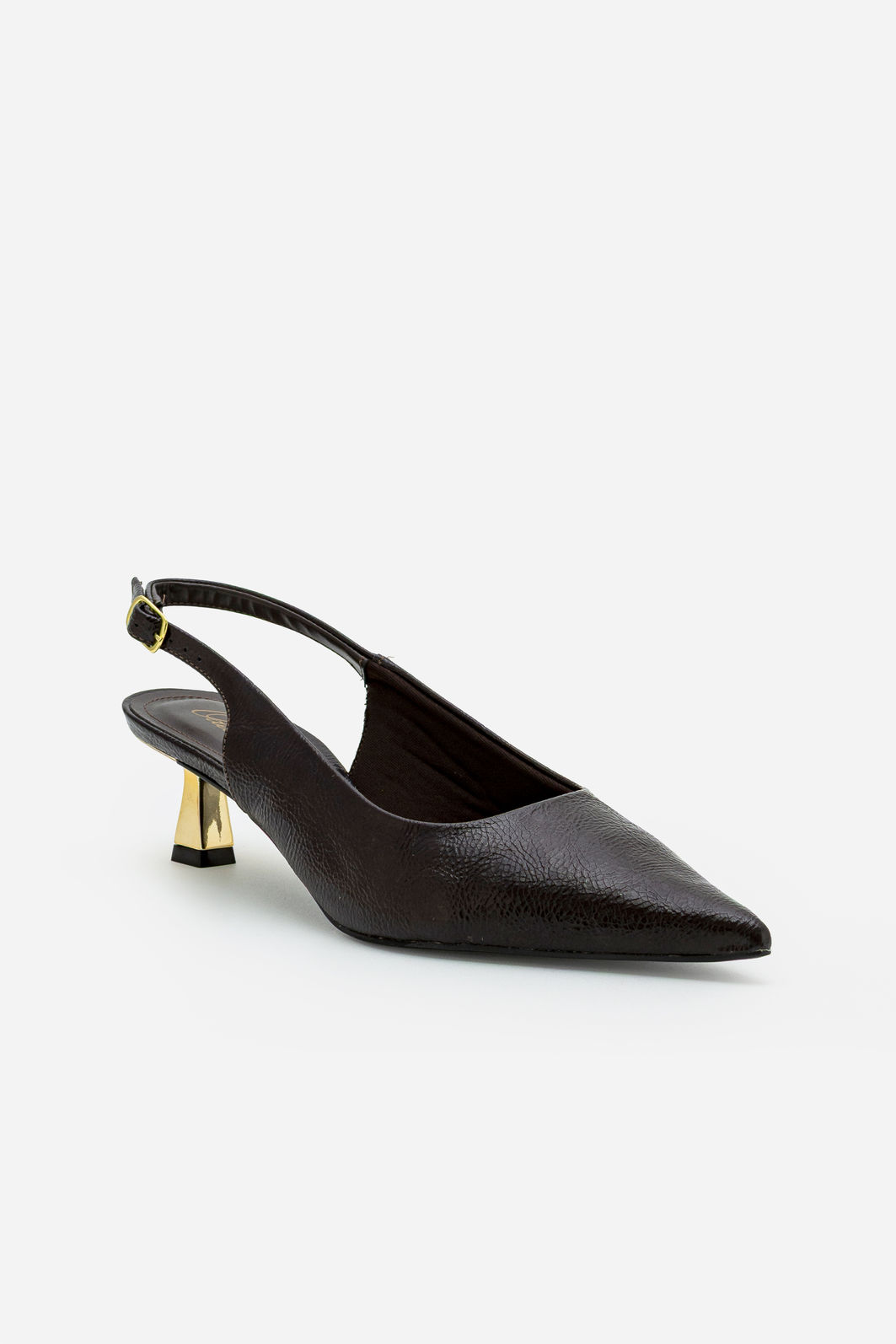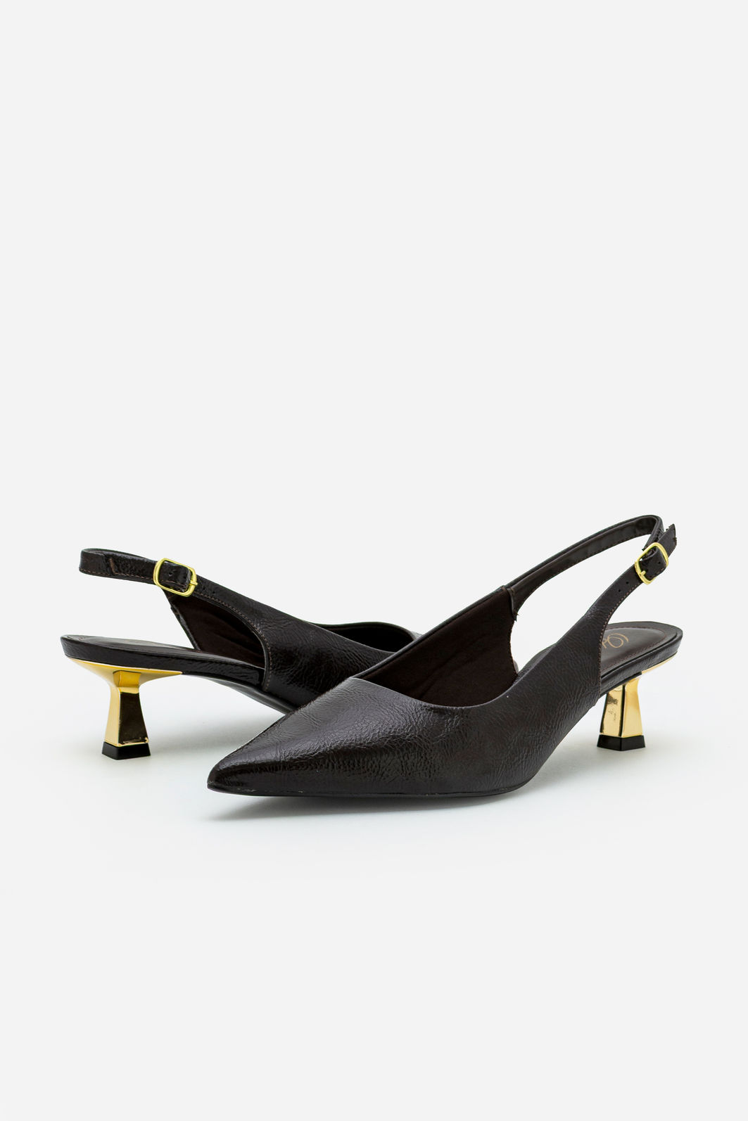 A tira traseira com fivela ajustável proporciona encaixe seguro e confortável, adaptando-se com precisão. O salto cromado é o grande diferencial, trazendo modernidade e sofisticação ao visual sem abrir mão da estabilidade. A palmilha macia garante conforto ao longo do uso, ideal para acompanhar a rotina com leveza.