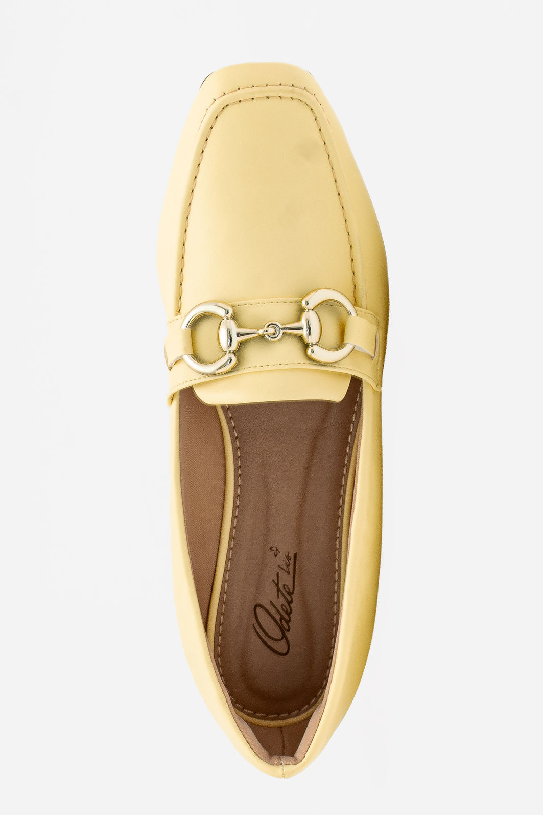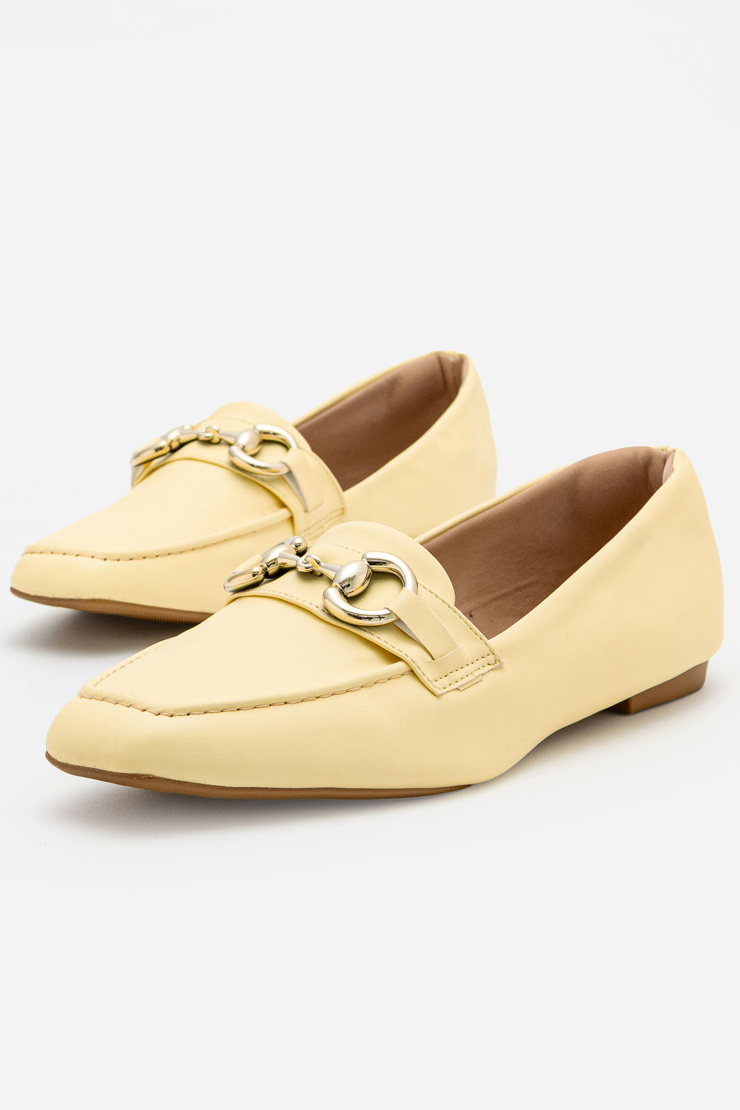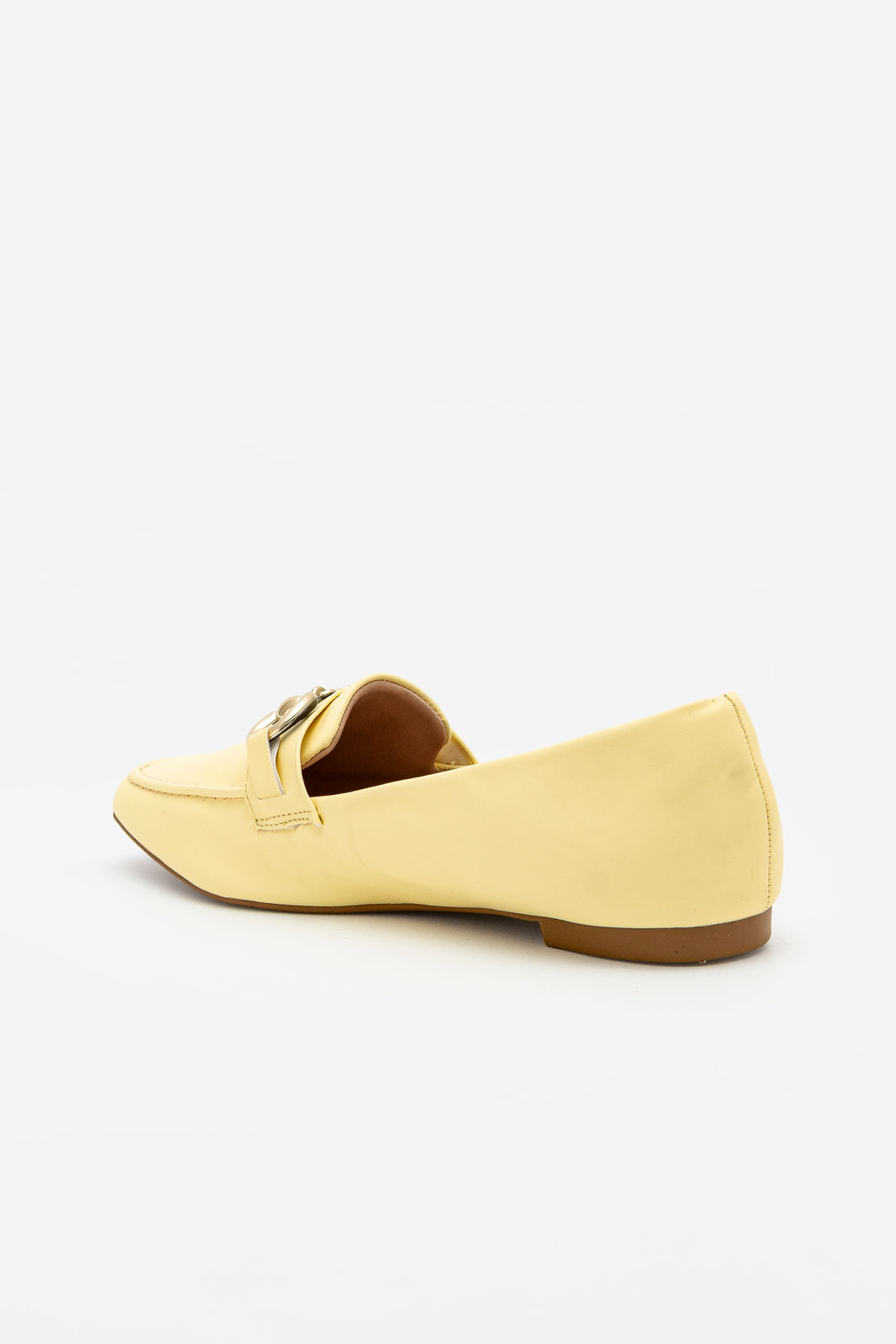 Elegante e moderno, o mocassim sintético amarelo é a escolha ideal para quem busca estilo com praticidade. O design em bico quadrado traz sofisticação atualizada, enquanto o enfeite metálico prateado adiciona um detalhe refinado que valoriza o calçado sem excessos.