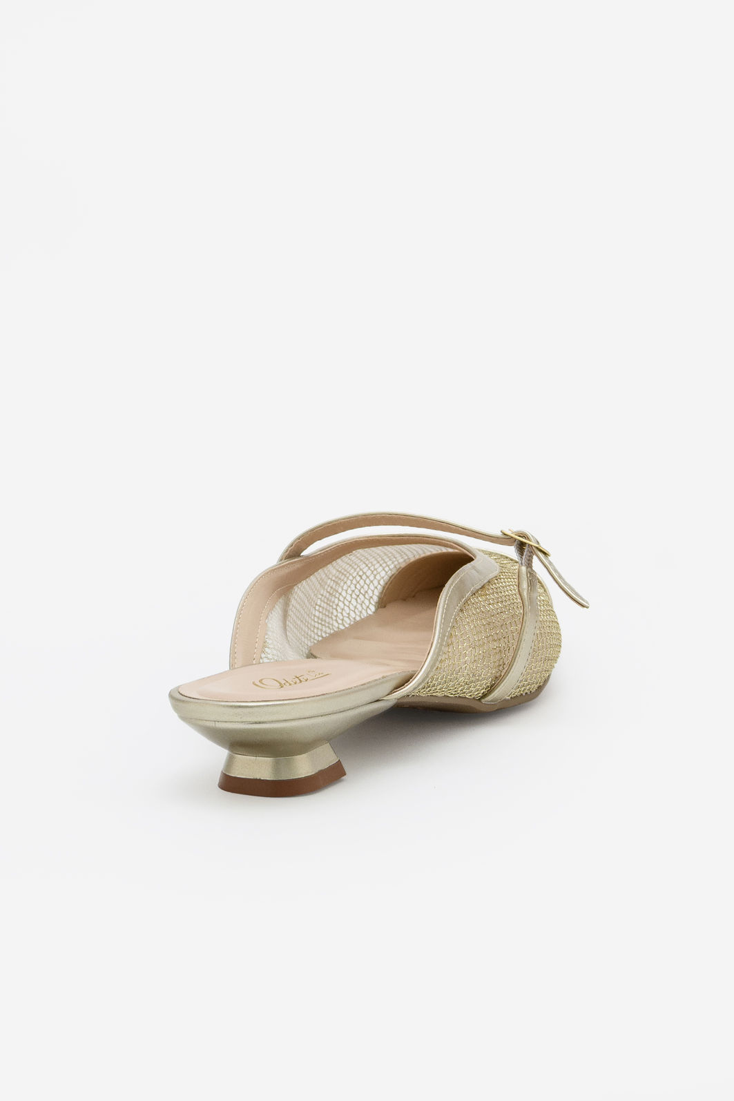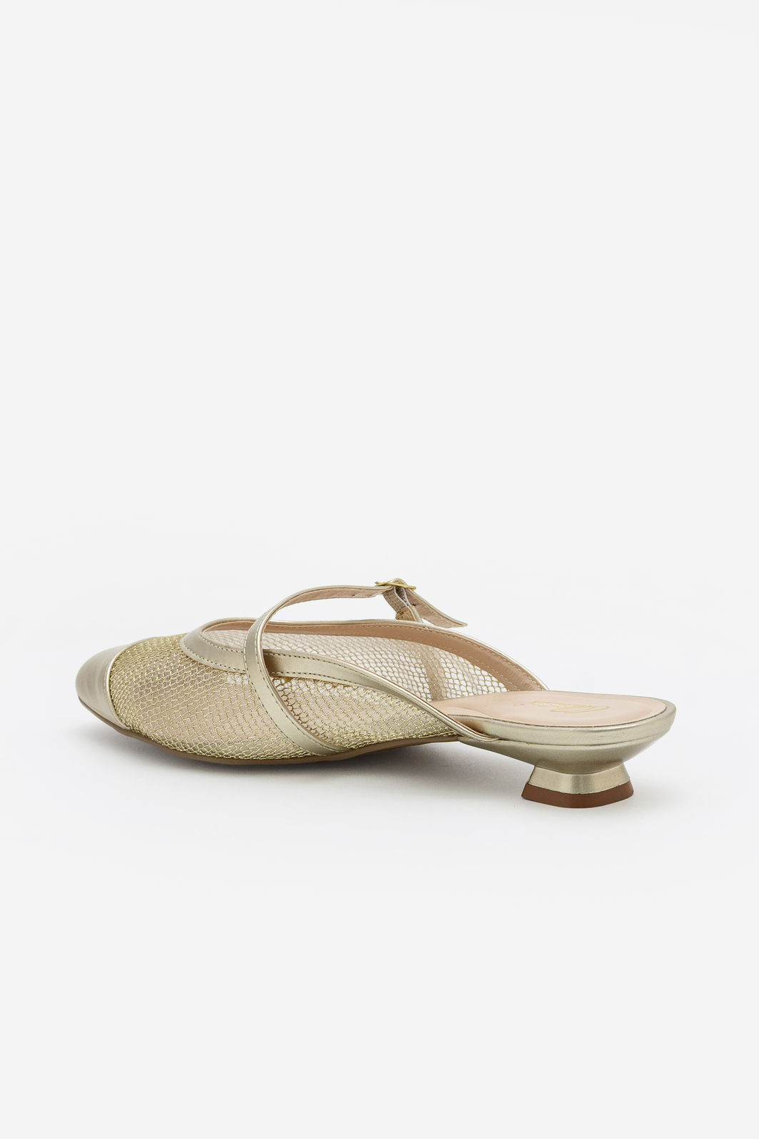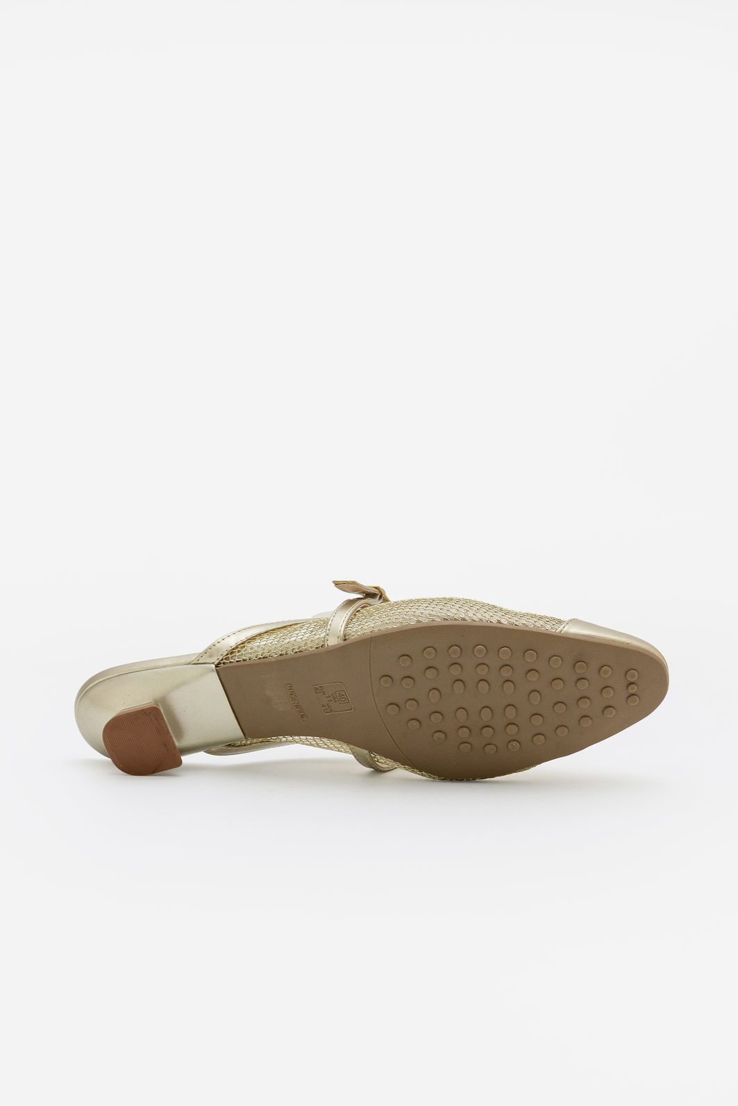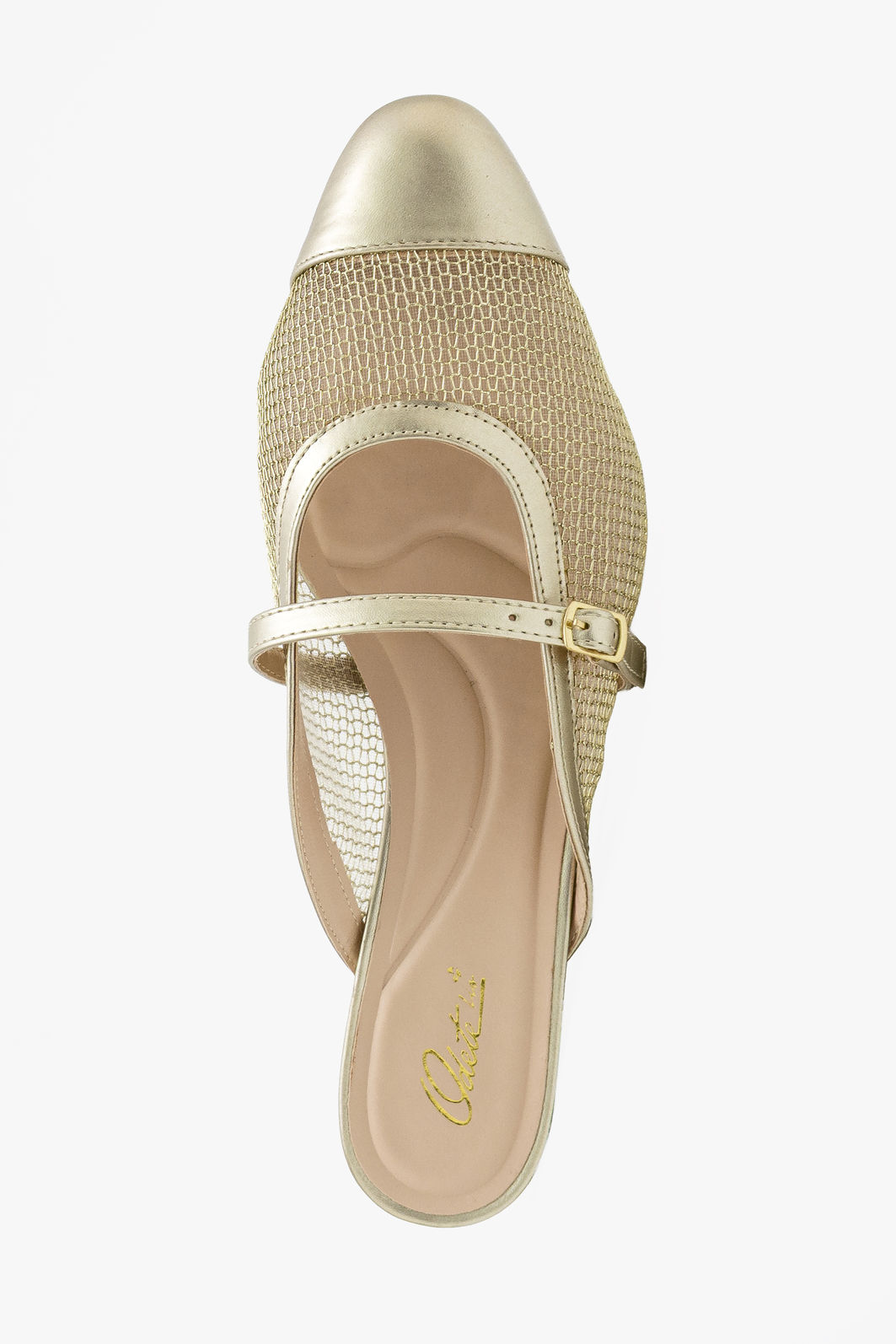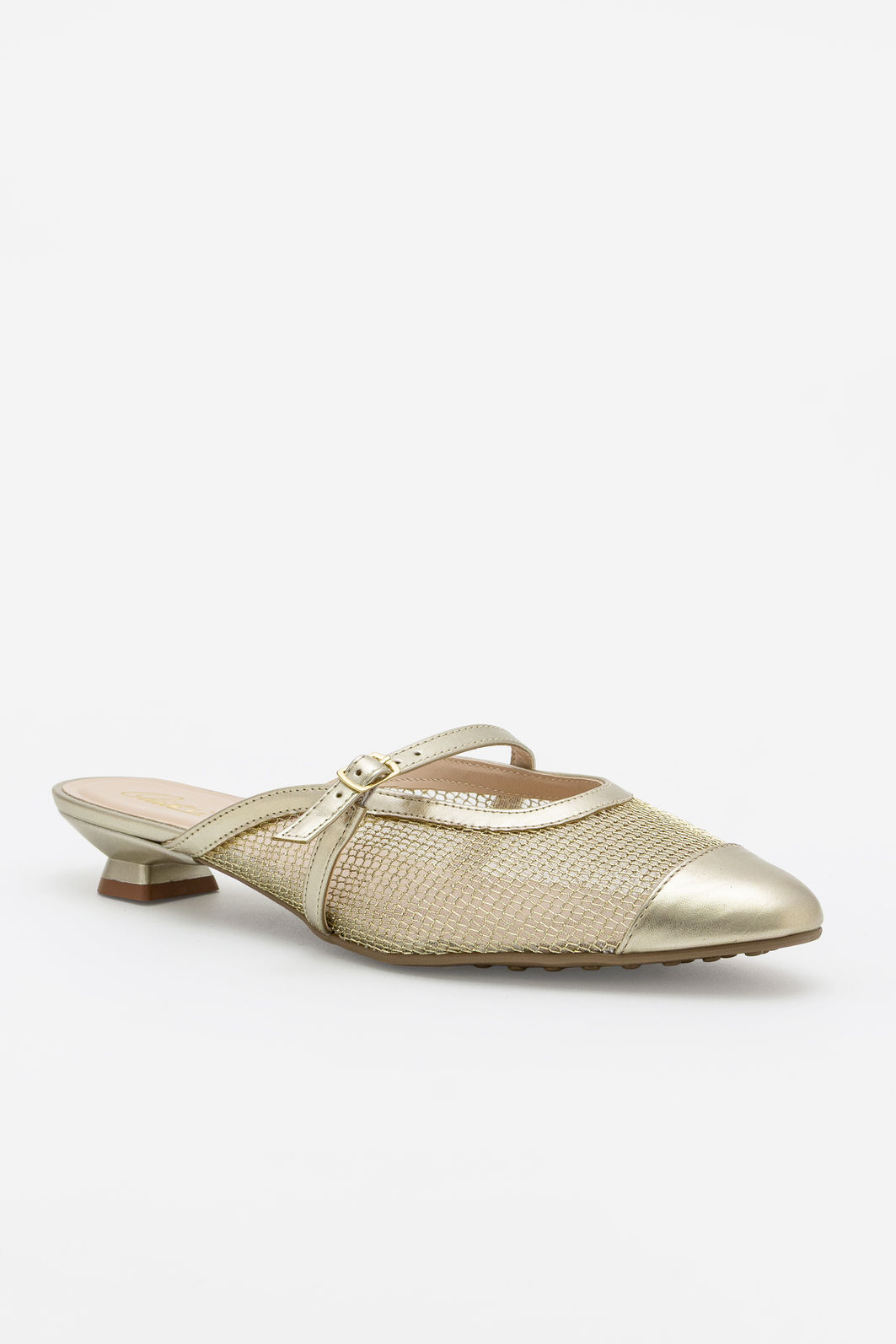 Elegância e leveza em perfeita harmonia. Este mule champagne traz um visual delicado e sofisticado, ideal para quem deseja um toque refinado em produções casuais ou elegantes. O cabedal em tela delicada cria um efeito arejado e moderno, revelando a pele de forma sutil e elegante.