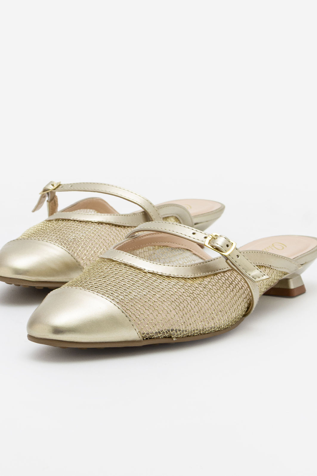 A ponteira e as bordas em acabamento metalizado champagne elevam o design com brilho discreto e sofisticado. A tira com fivela dourada acrescenta charme e personalidade, enquanto o salto baixo geométrico garante conforto e estabilidade ao caminhar.