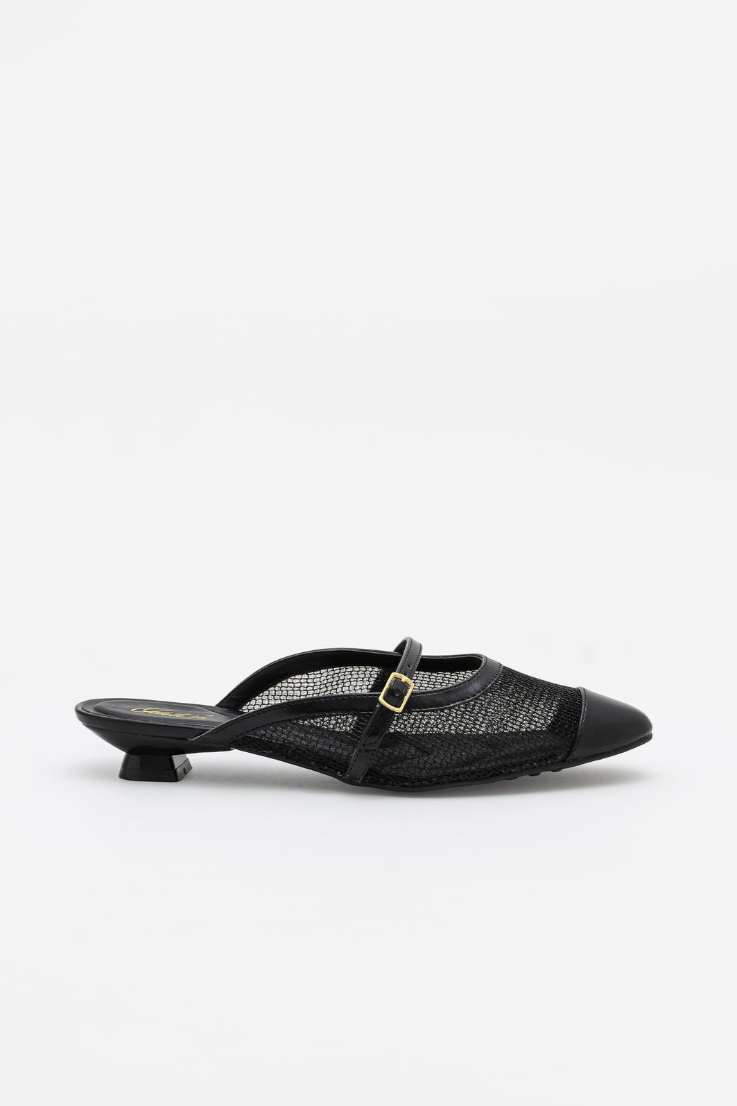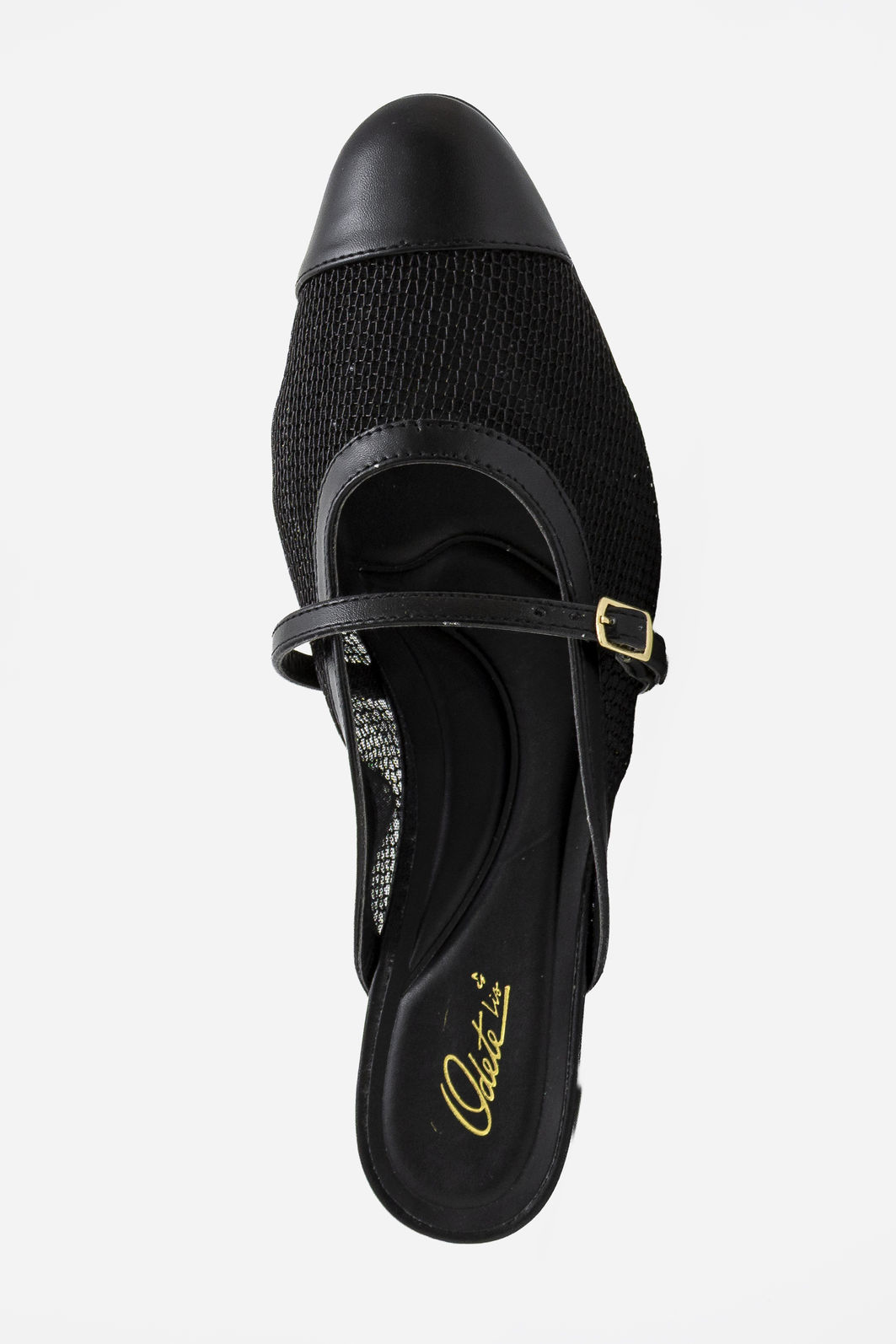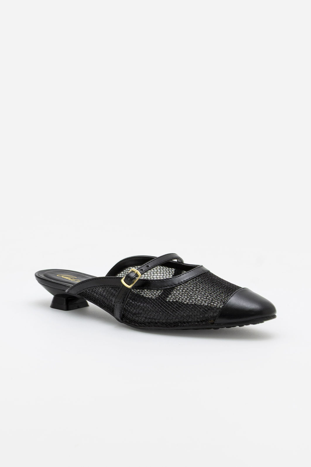 Sofisticado e moderno, este mule preto combina leveza com elegância atemporal. O cabedal em tela delicada cria um efeito visual leve e arejado, revelando sutileza nos pés e garantindo frescor em qualquer estação. A ponteira em material sintético liso realça o design clássico, enquanto a tira com fivela dourada adiciona um toque feminino e contemporâneo.