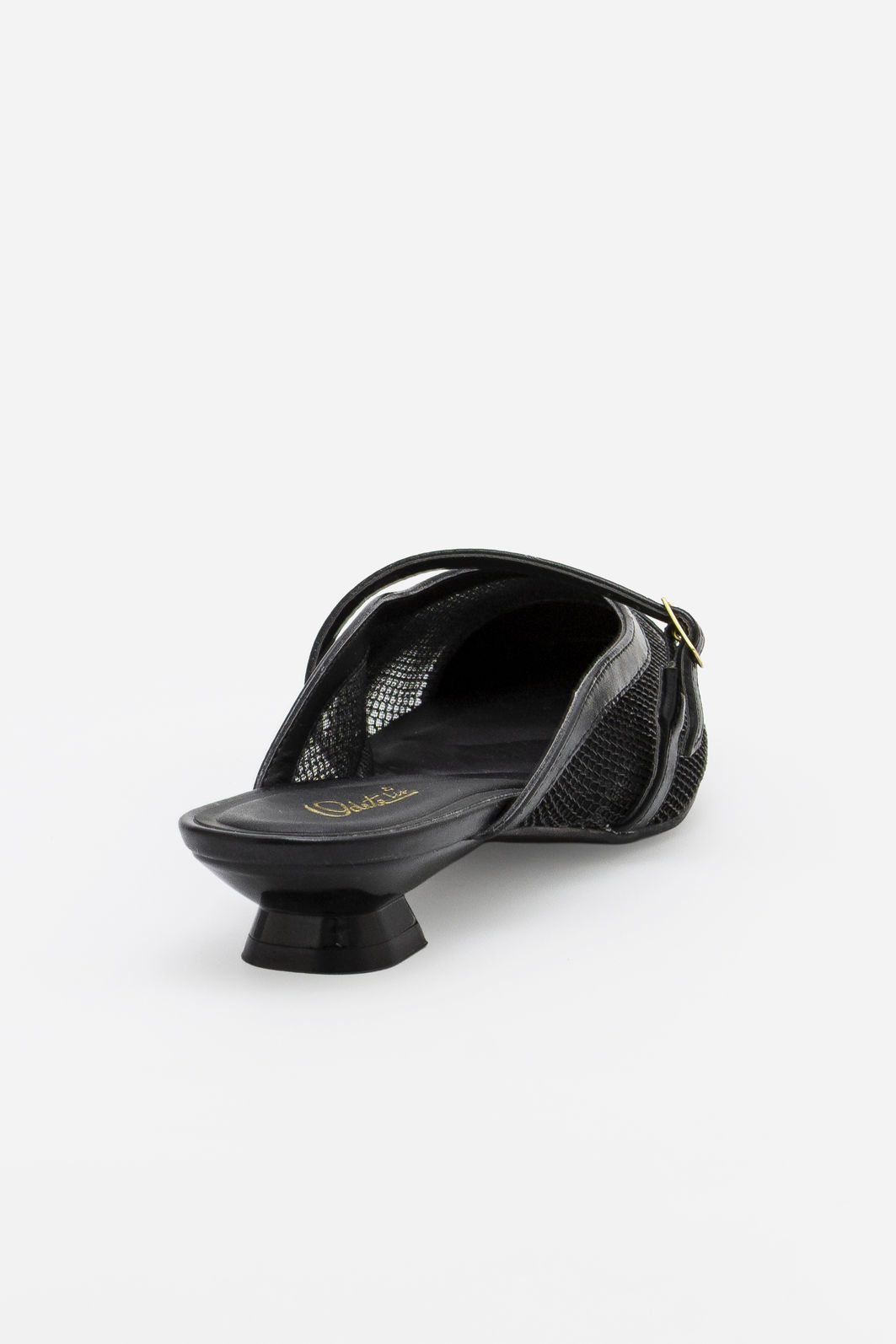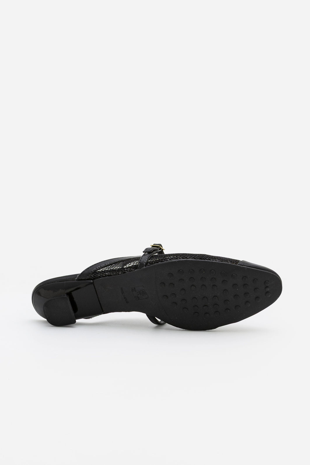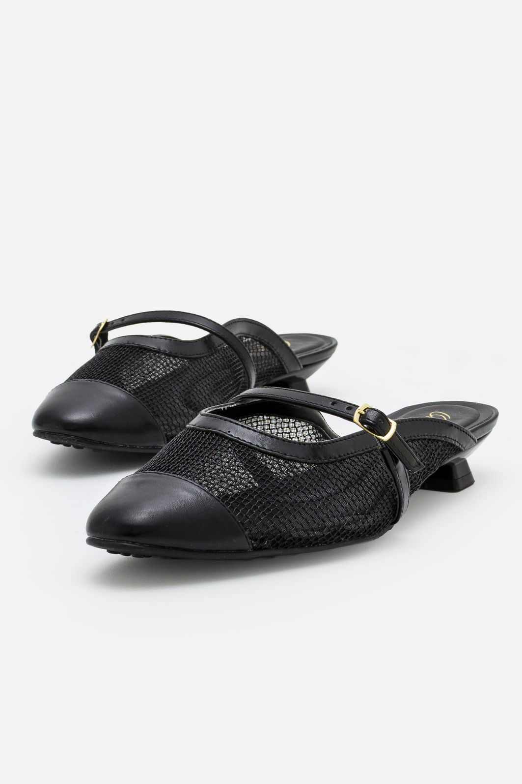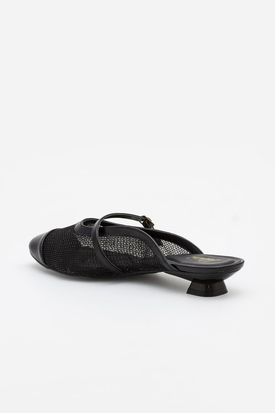 Sofisticado e moderno, este mule preto combina leveza com elegância atemporal. O cabedal em tela delicada cria um efeito visual leve e arejado, revelando sutileza nos pés e garantindo frescor em qualquer estação. A ponteira em material sintético liso realça o design clássico, enquanto a tira com fivela dourada adiciona um toque feminino e contemporâneo.