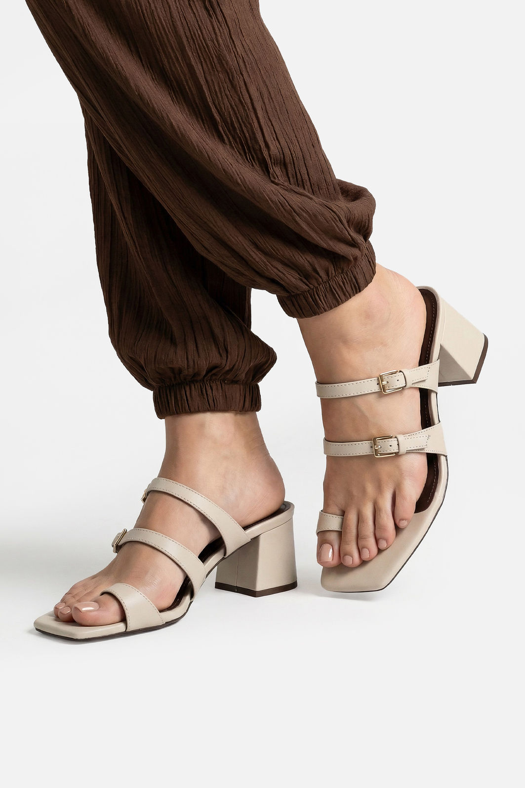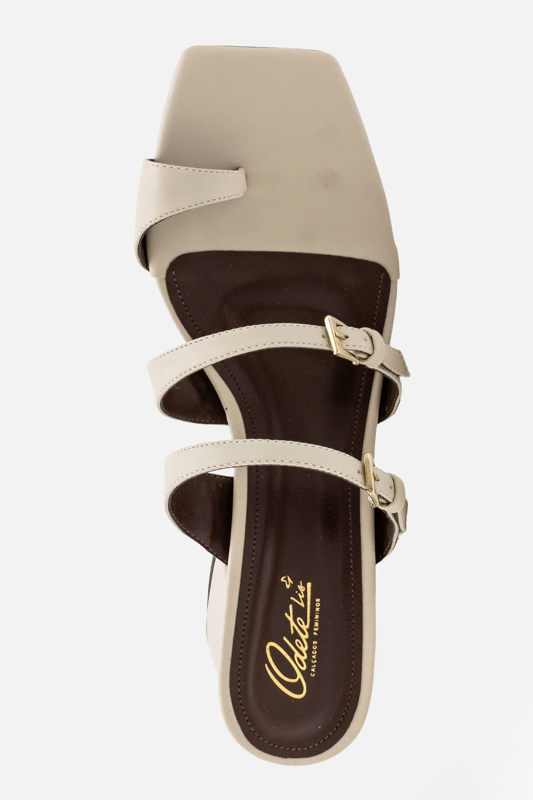 Esta mule off white foi criada para quem busca um visual moderno, limpo e sofisticado. As tiras finas com fivelas delicadas moldam o pé com leveza, enquanto o detalhe do dedão acrescenta personalidade e segurança ao caminhar. O acabamento polido realça a elegância do modelo e garante uma estética impecável sob qualquer ângulo.