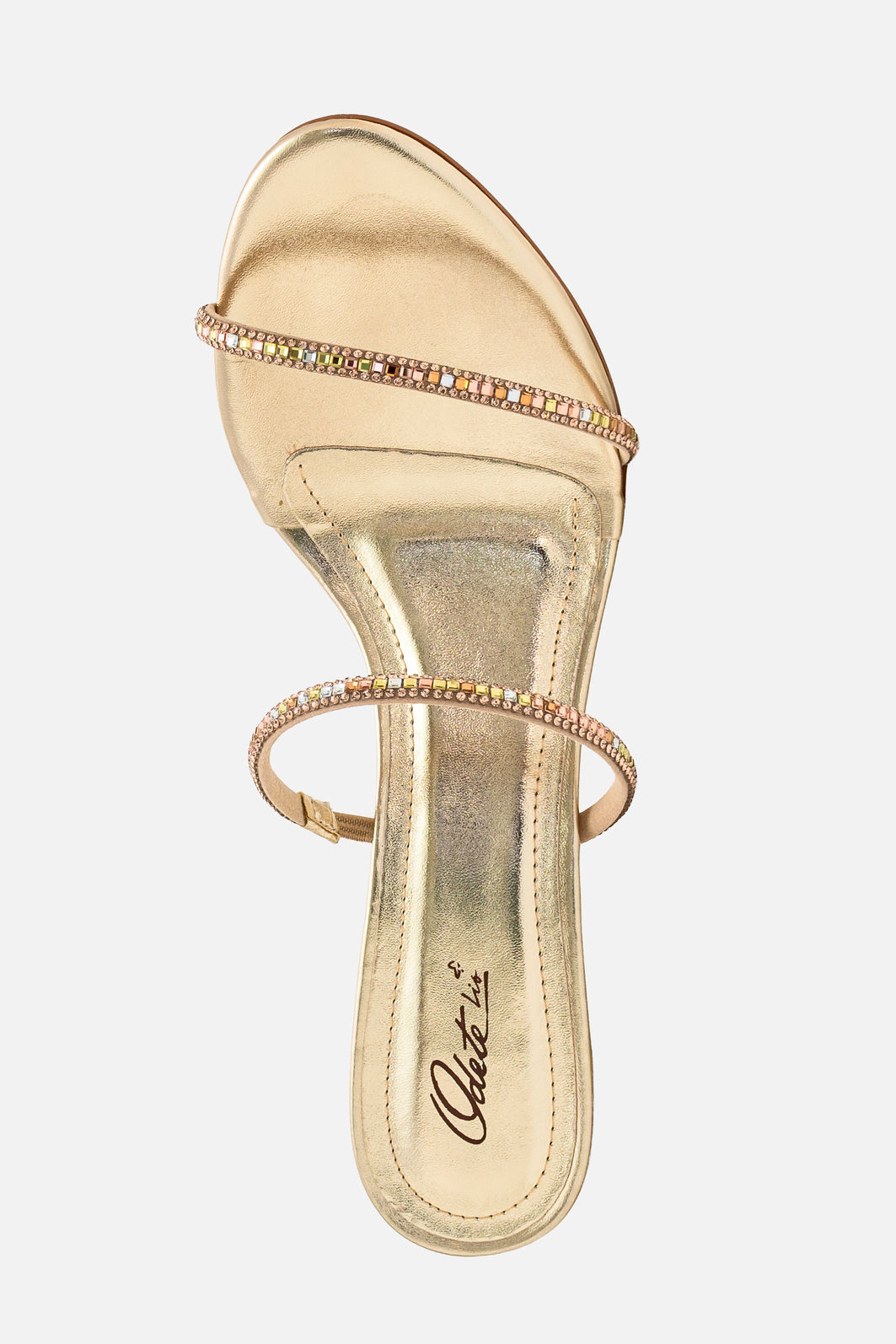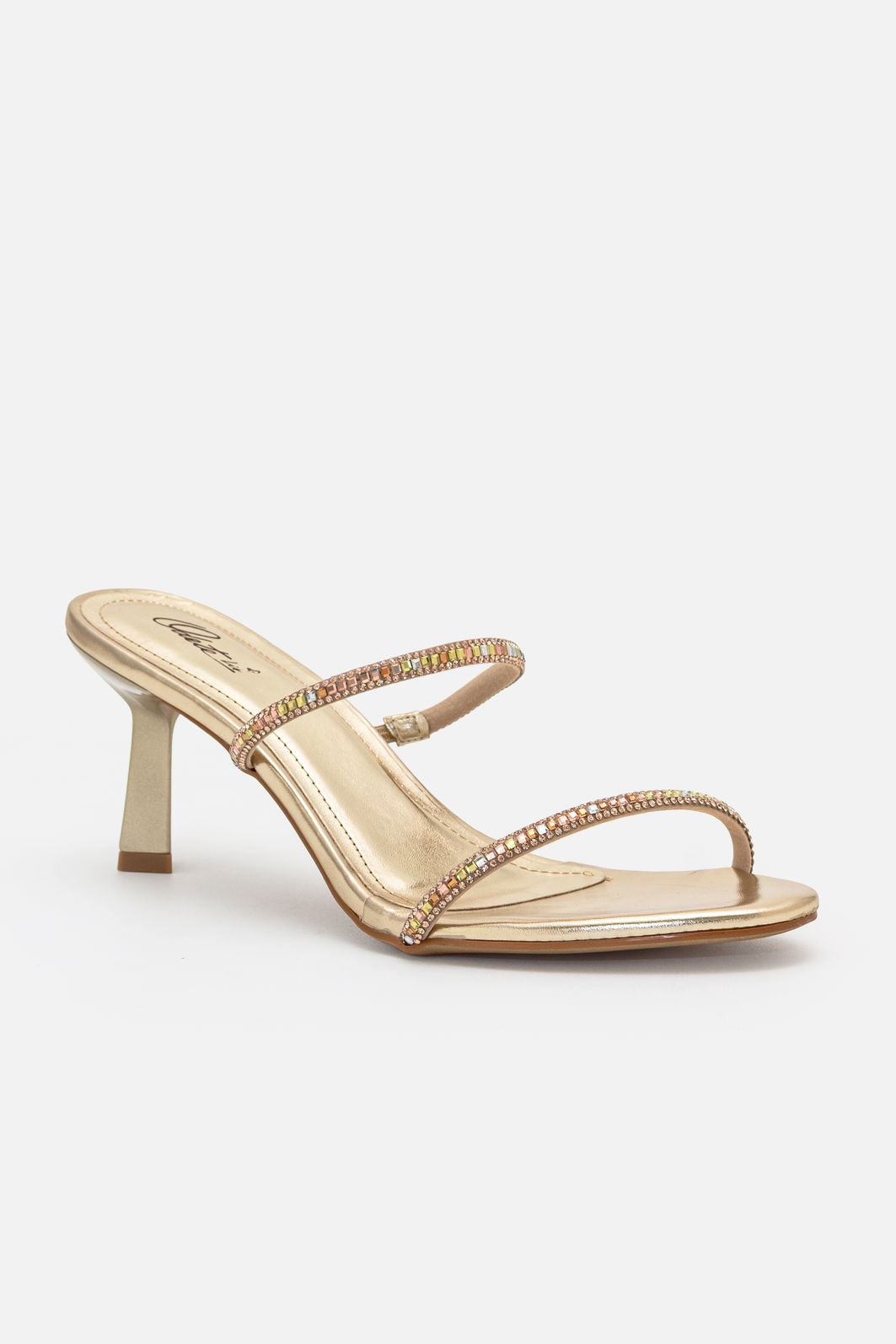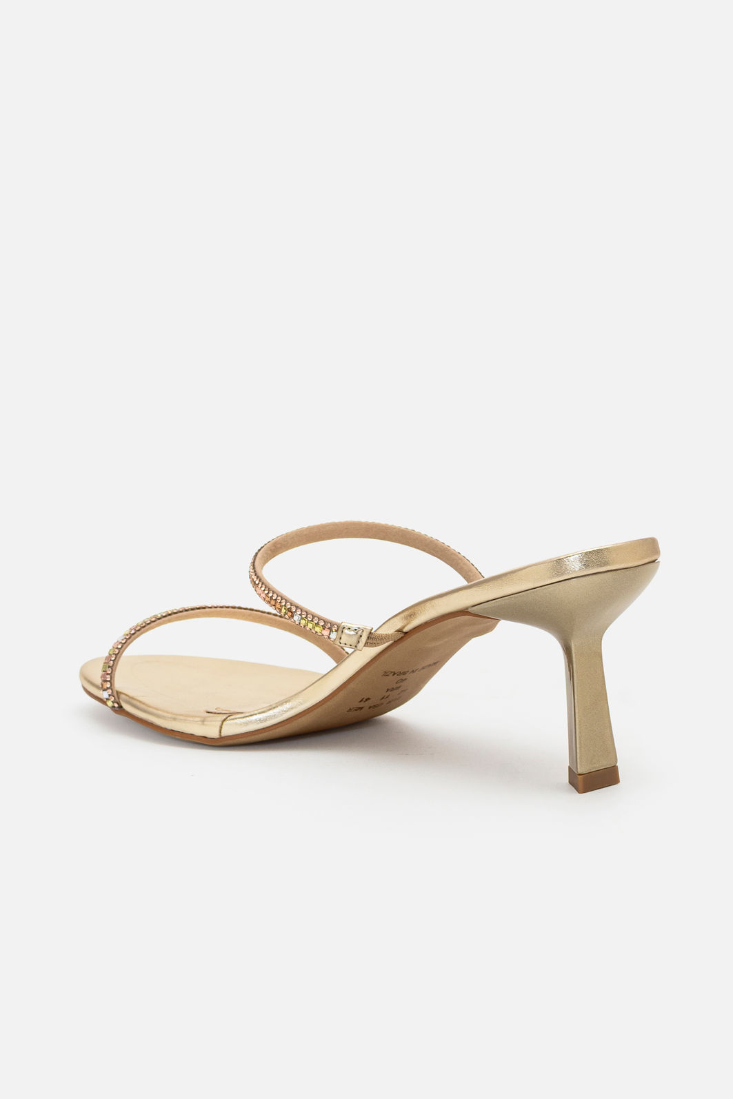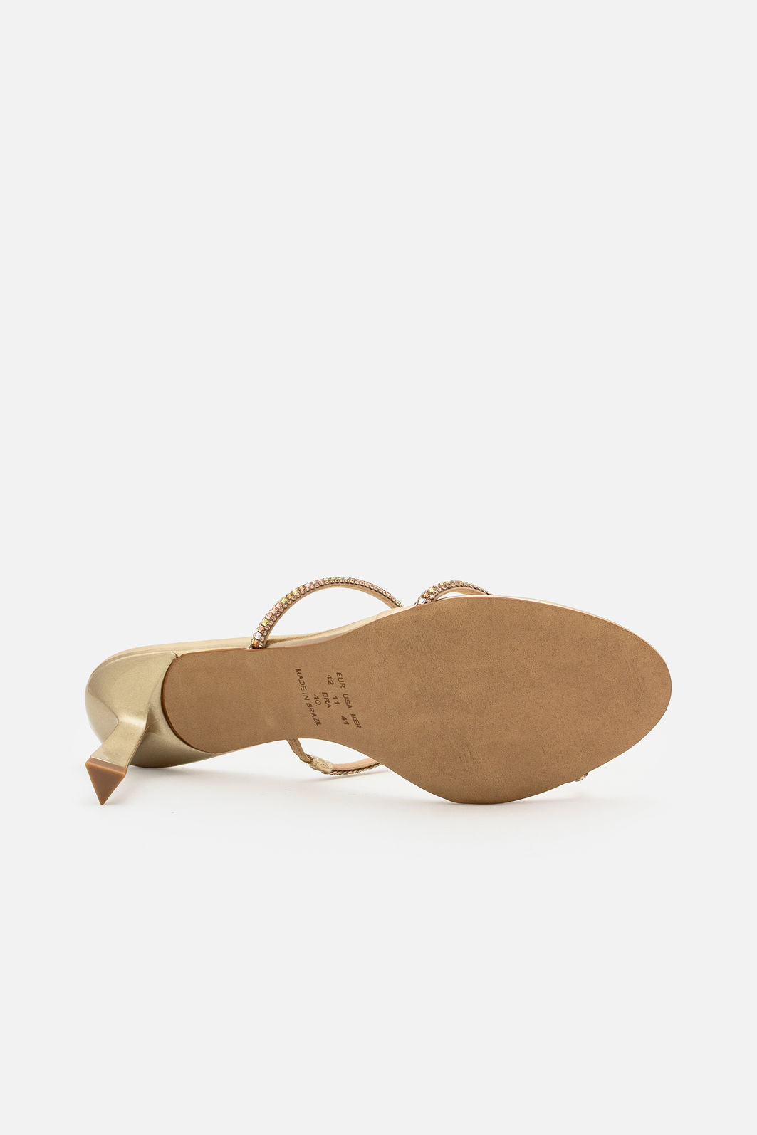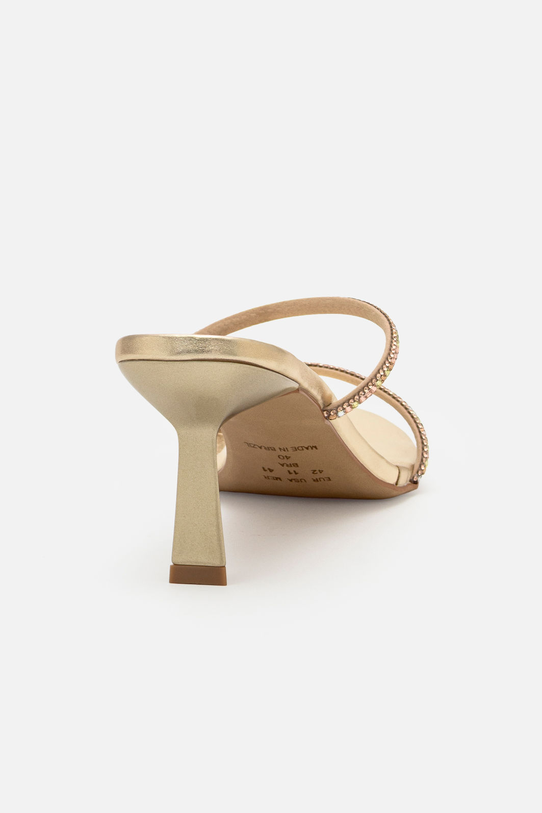 A mule em napa metalizada com tiras de brilho ouro traduz sofisticação e feminilidade em cada detalhe. O design minimalista valoriza o pé com delicadeza, enquanto as tiras finas com aplicação de pedrarias garantem um toque de glamour sutil e elegante.