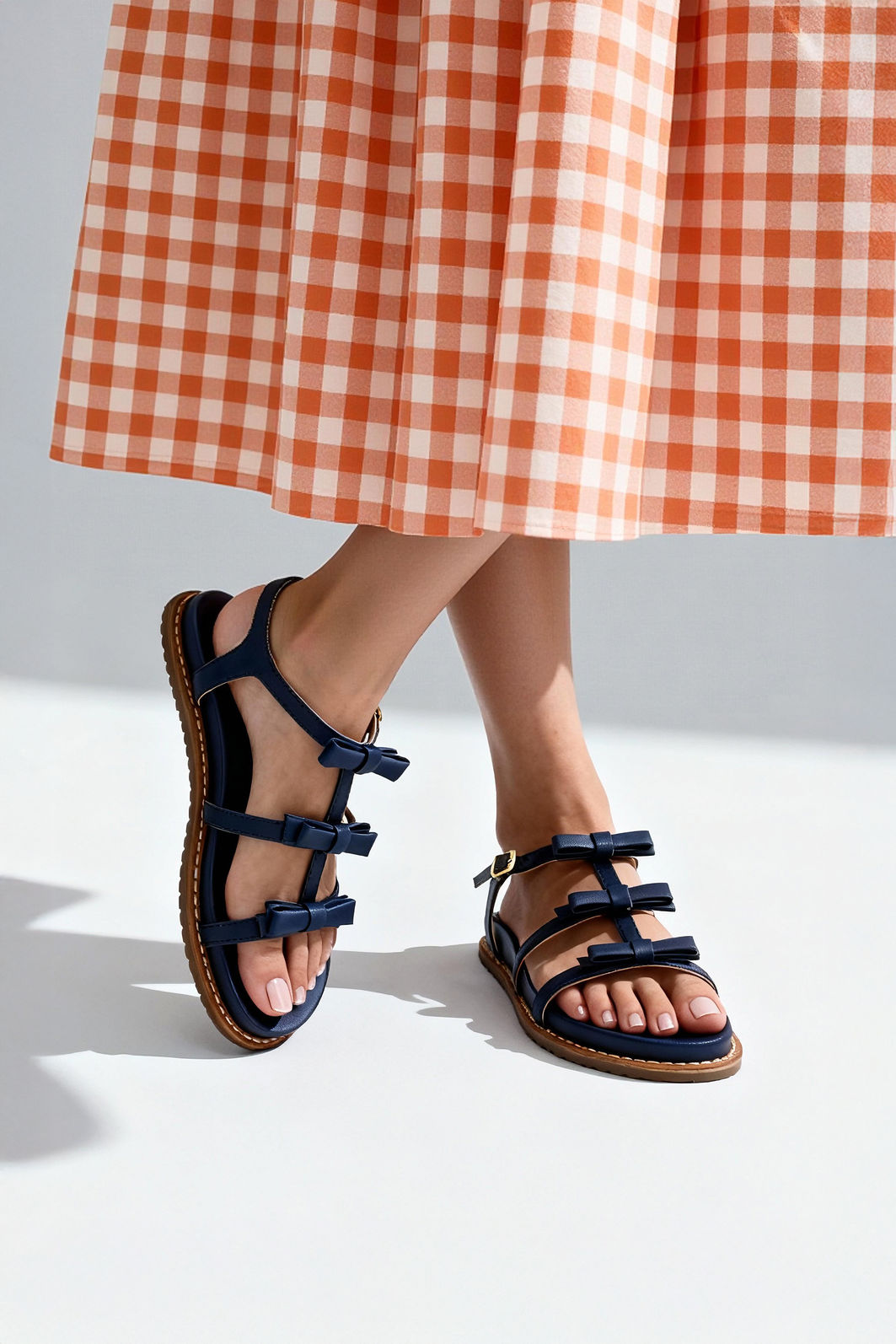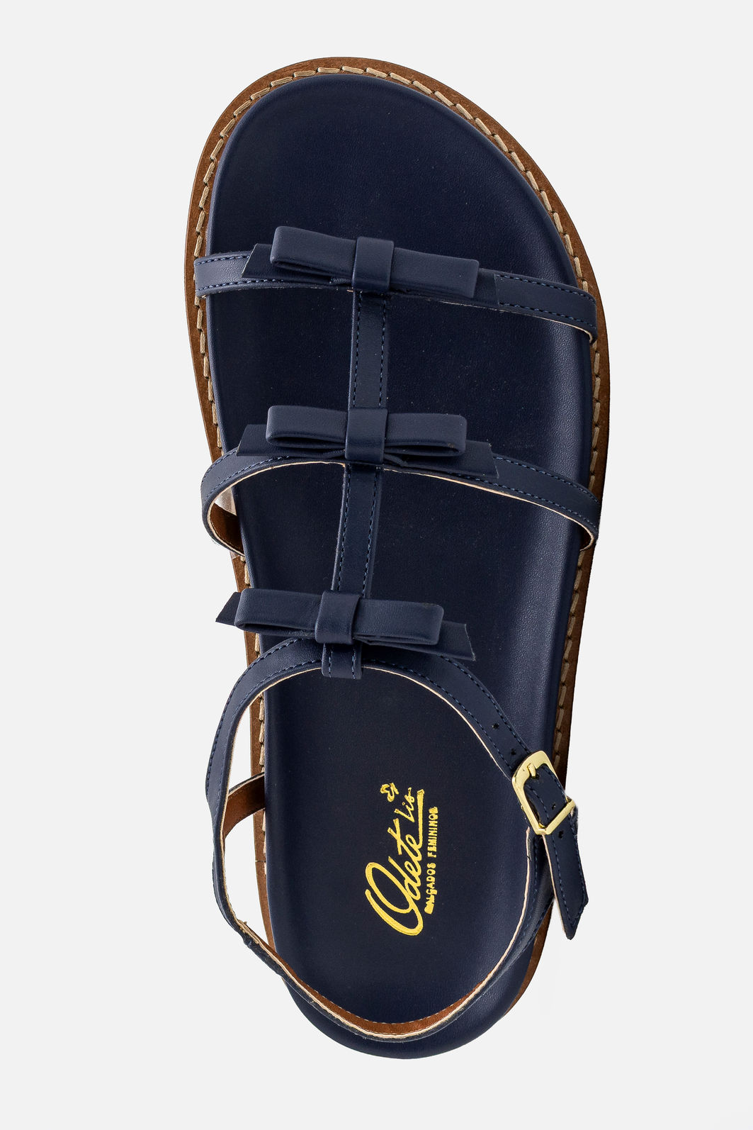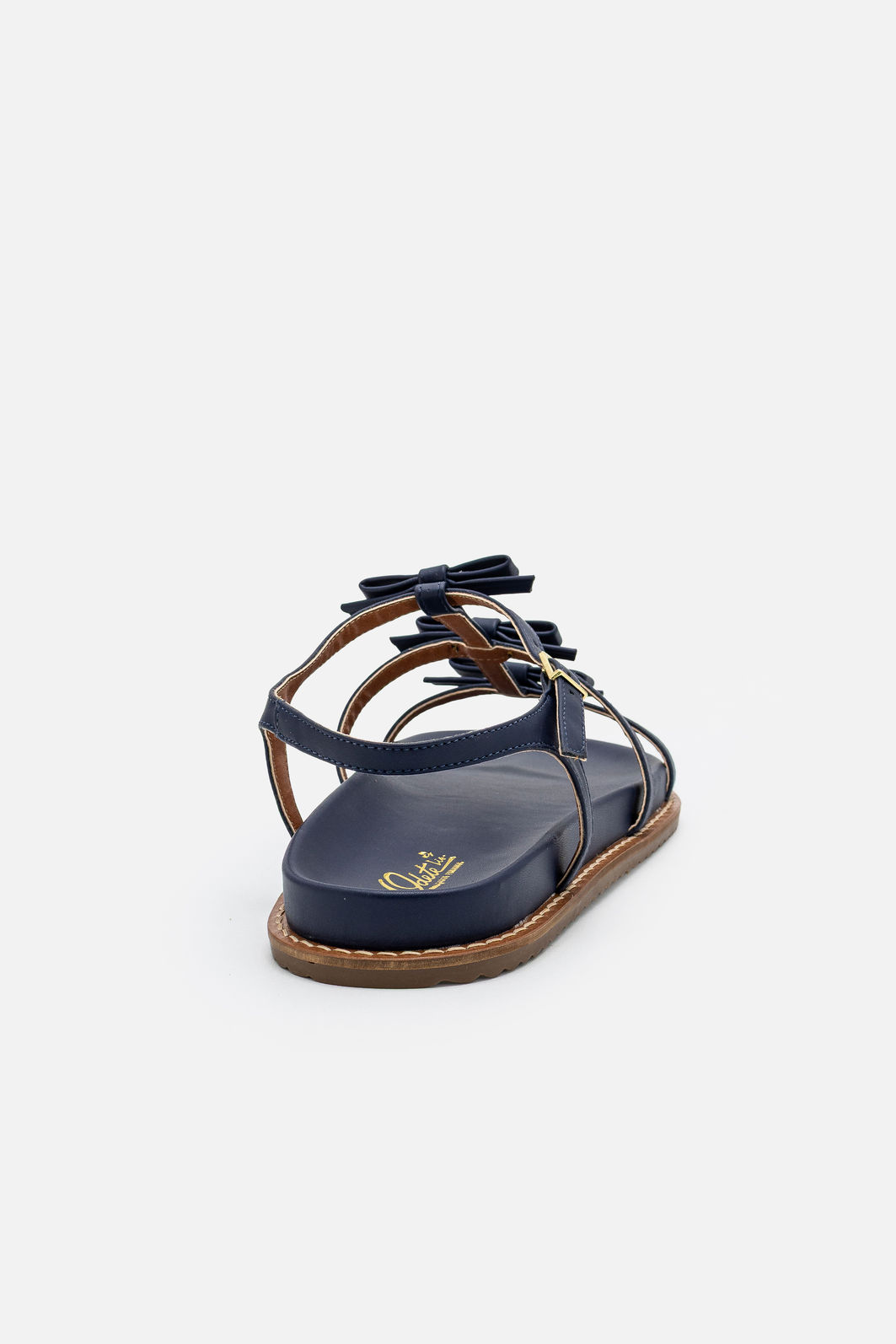 A papete em azul marinho destaca um visual delicado e contemporâneo com três lacinhos perfeitamente estruturados, que adicionam charme sem comprometer a elegância. Suas tiras são macias, reforçadas e cuidadosamente posicionadas para garantir firmeza ao caminhar. O acabamento limpo, com costura aparente no solado, realça a qualidade do design e assegura durabilidade no uso diário.