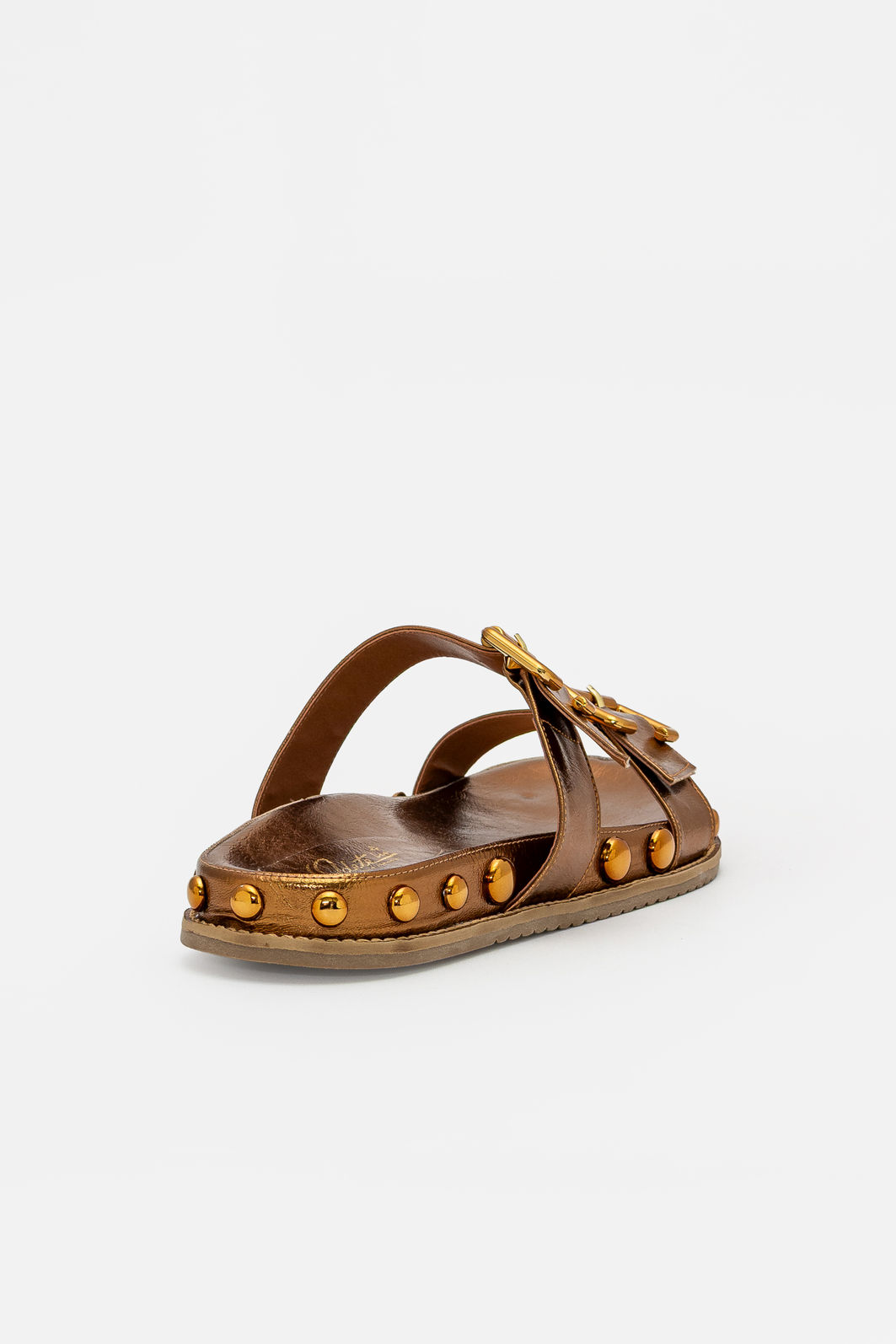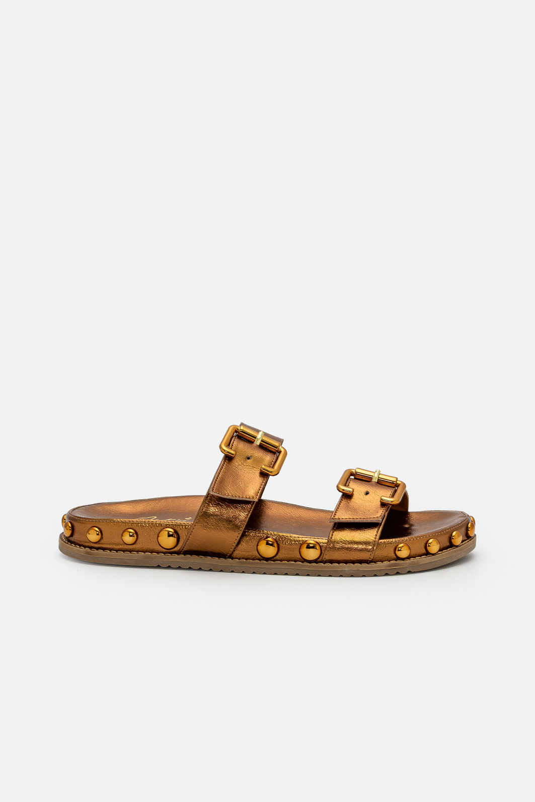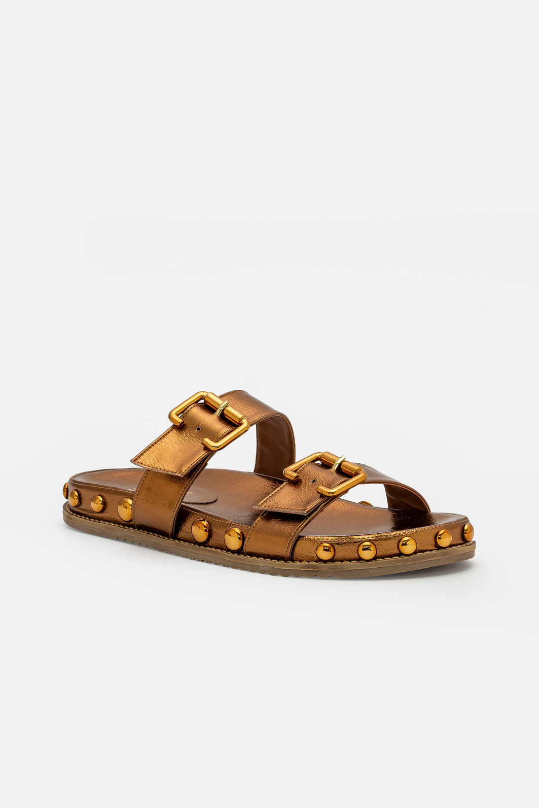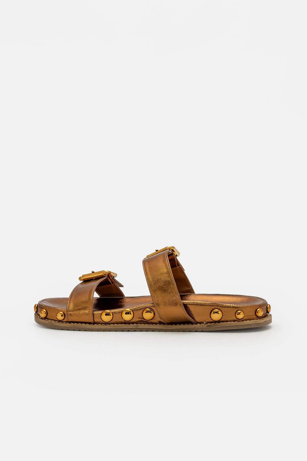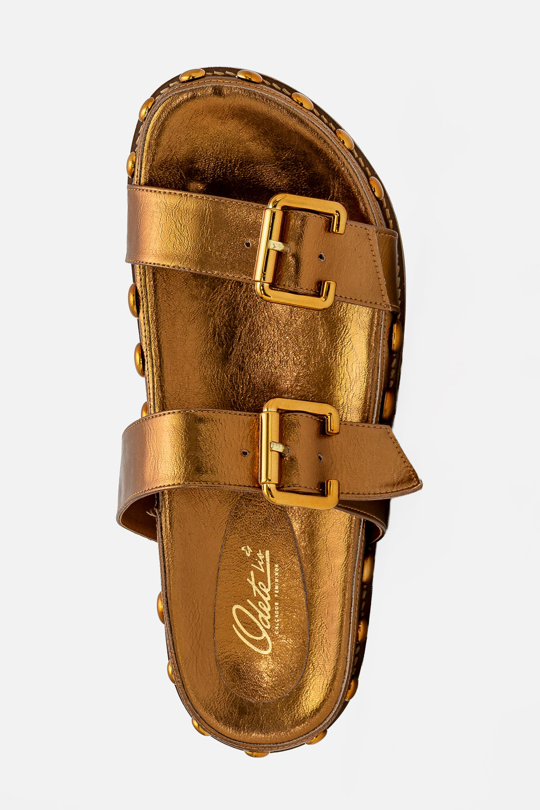 O acabamento metalizado em tom bronze confere modernidade e destaque na medida certa, iluminando o visual sem excessos. Os rebites aplicados ao redor da sola reforçam a estética atual e criam um contraste interessante, elevando o design com atitude e refinamento.