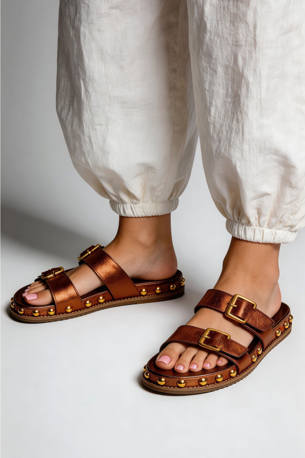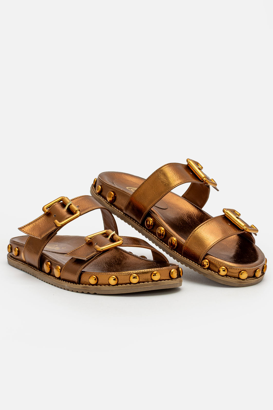 Com brilho sofisticado e design contemporâneo, esta papete bronze é a escolha perfeita para quem deseja unir conforto e estilo com personalidade. As tiras largas estruturam o modelo com elegância, enquanto as fivelas metálicas trazem um toque marcante e permitem ajuste preciso aos pés.