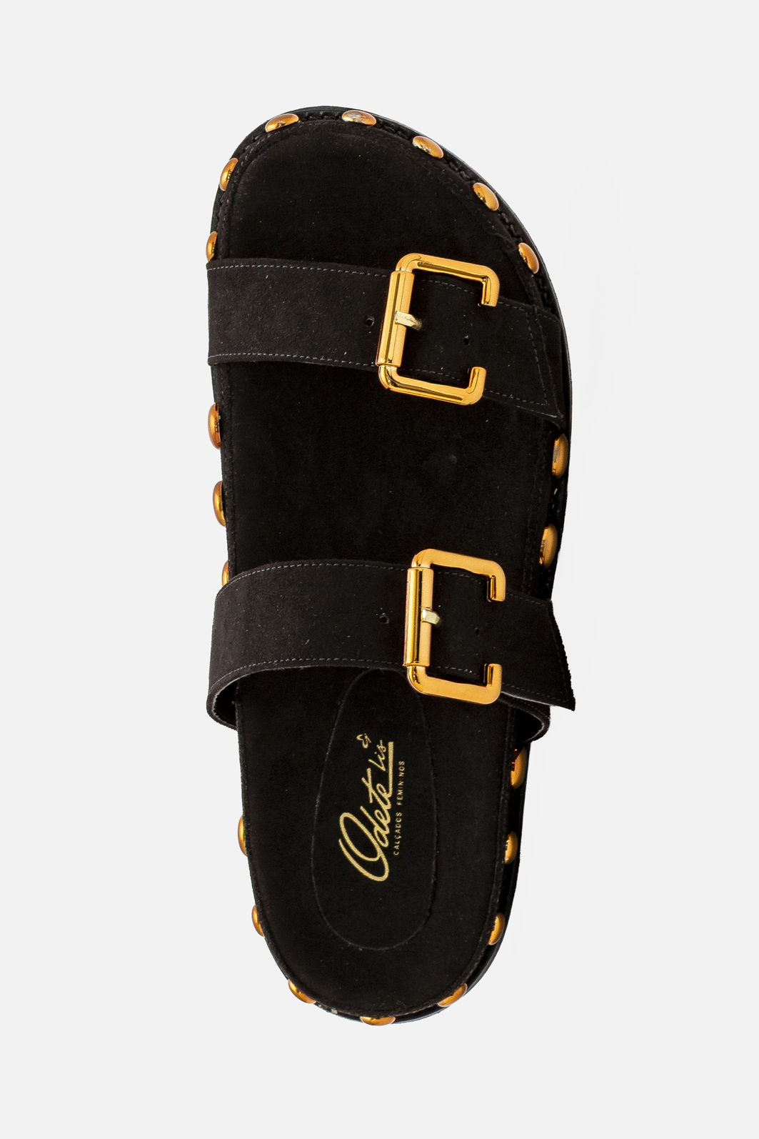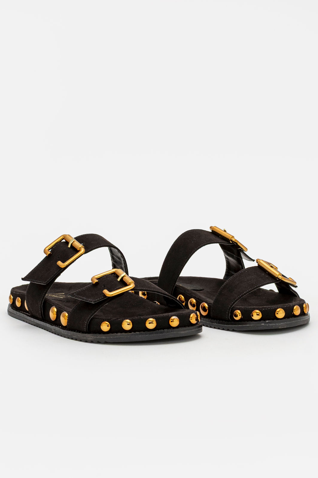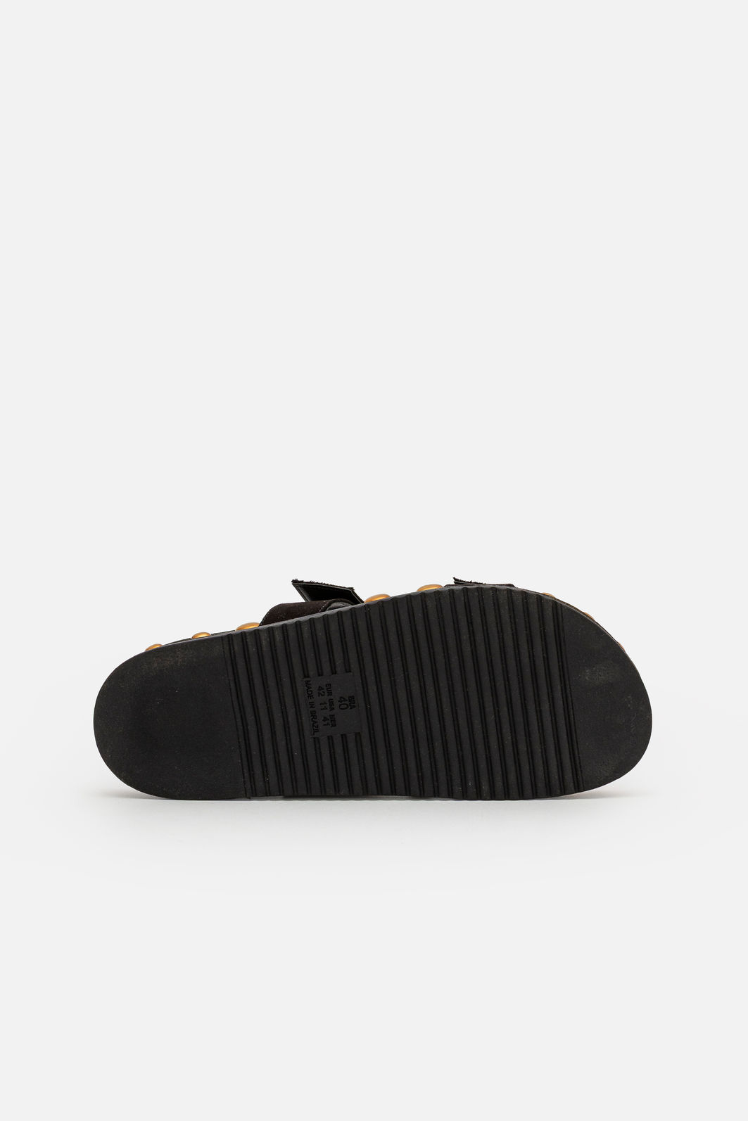 Com estética contemporânea e atitude marcante, esta papete preta é a escolha ideal para quem valoriza estilo com praticidade. As tiras largas estruturam o visual com personalidade, enquanto as fivelas metálicas trazem um toque urbano sofisticado e permitem ajuste preciso aos pés.
