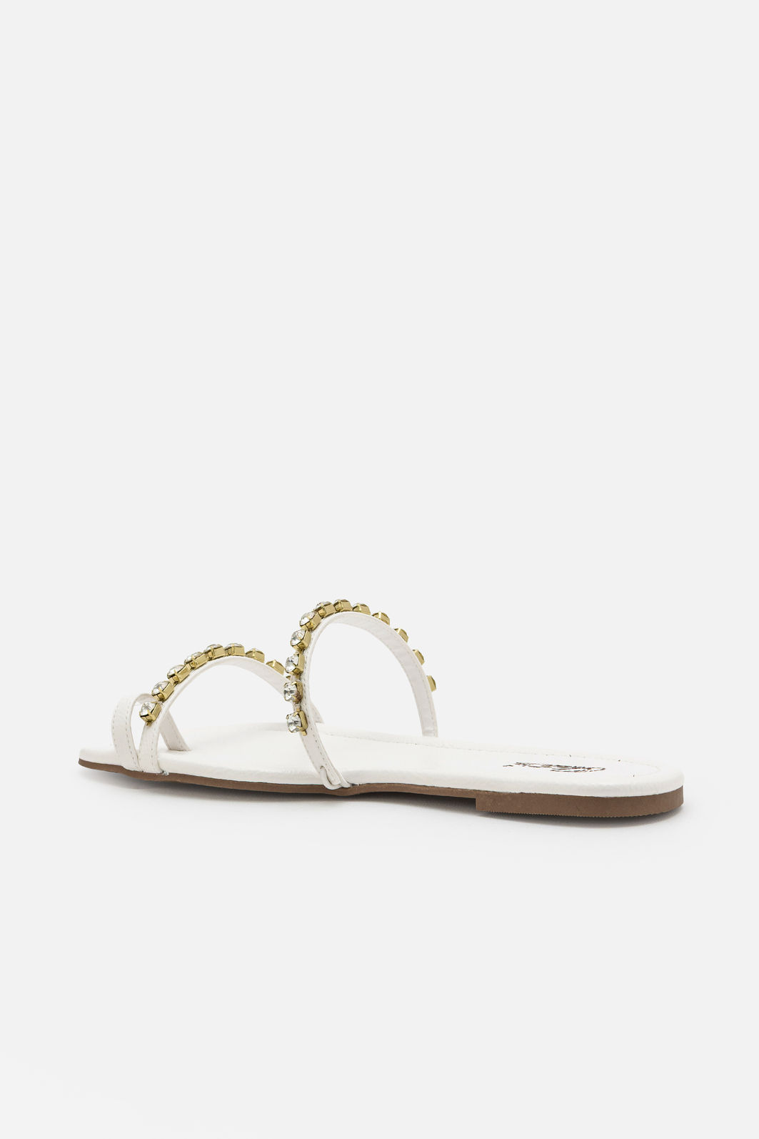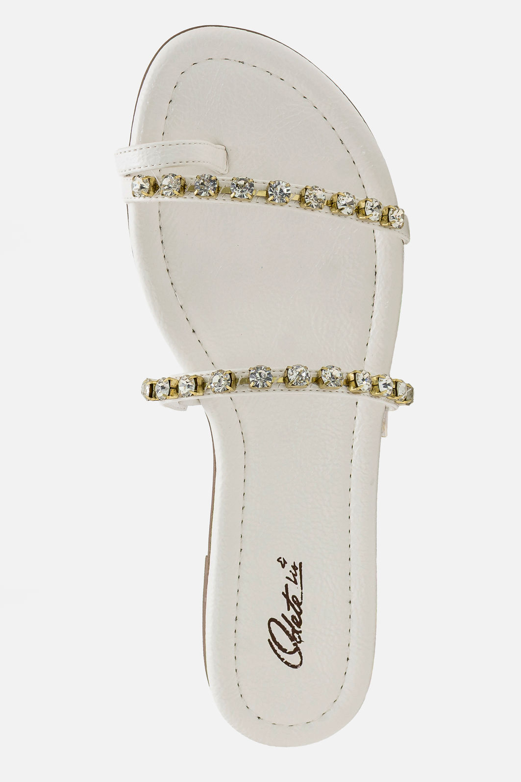Elegante e atemporal, essa rasteira feminina branca traduz sofisticação em um design leve e refinado. As tiras delicadas recebem aplicações de strass que adicionam brilho sutil e iluminam o visual com discrição, valorizando produções elegantes sem excessos.