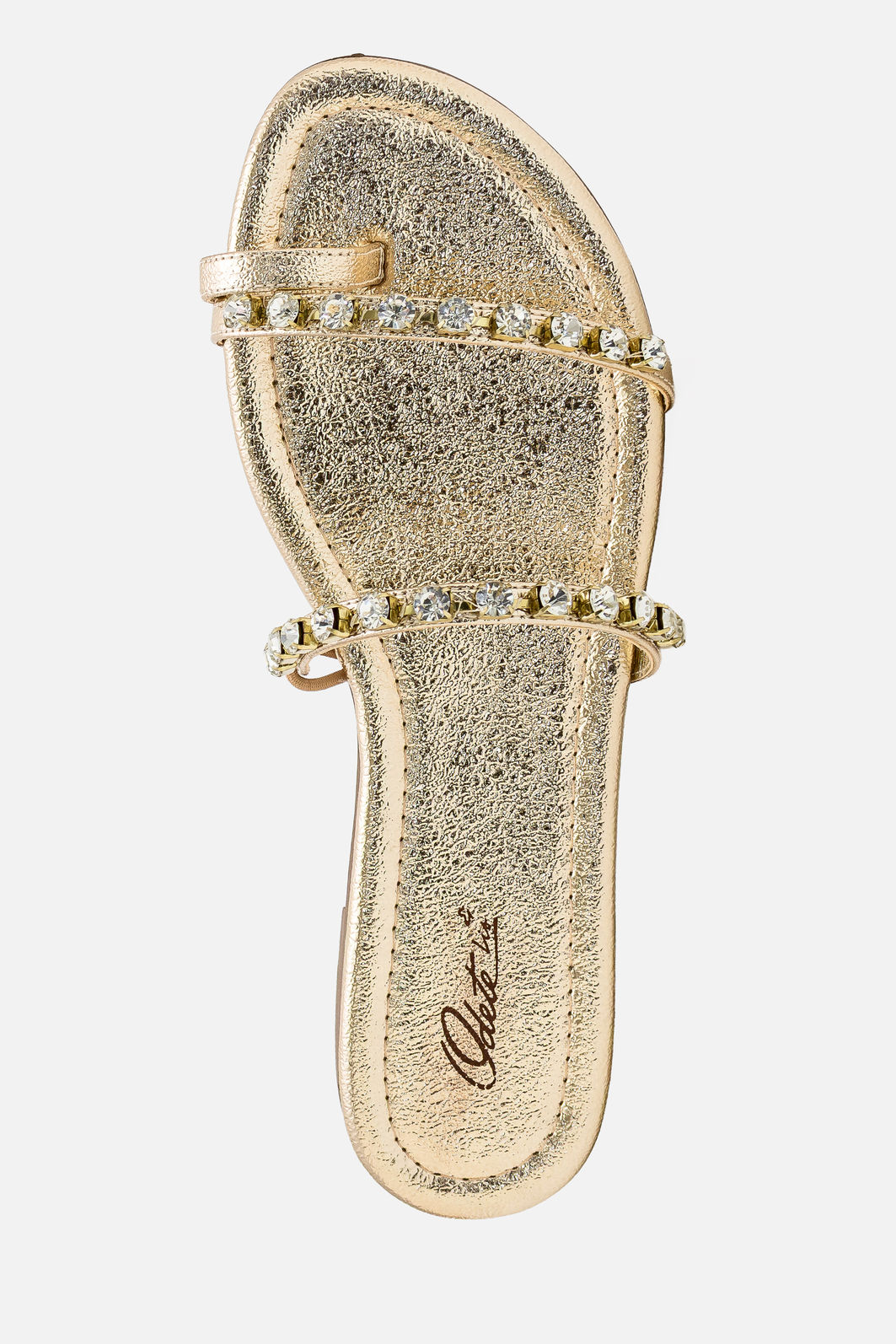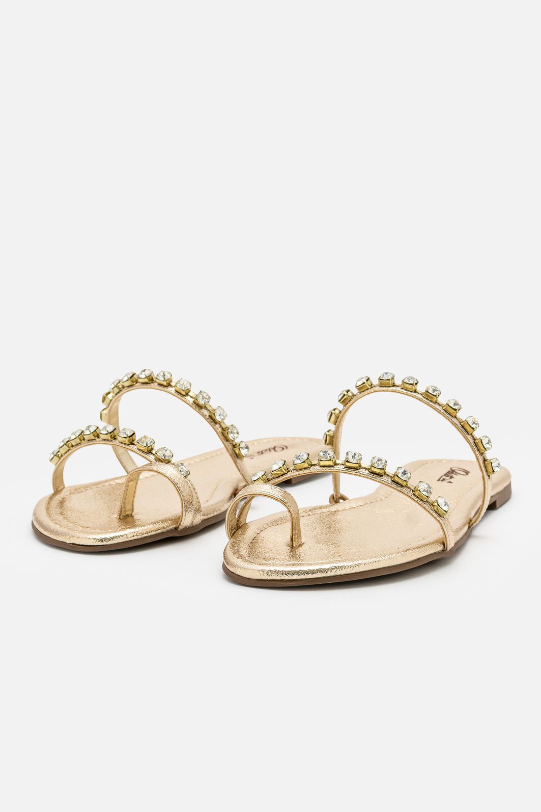 Delicada na medida certa, essa rasteira feminina em tom ouro foi criada para mulheres que valorizam elegância sem esforço. O design minimalista ganha sofisticação com aplicações de strass cuidadosamente alinhadas, que iluminam o visual com brilho sutil e refinado, perfeito para quem prefere luxo discreto.