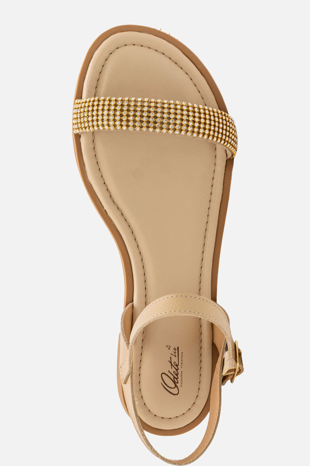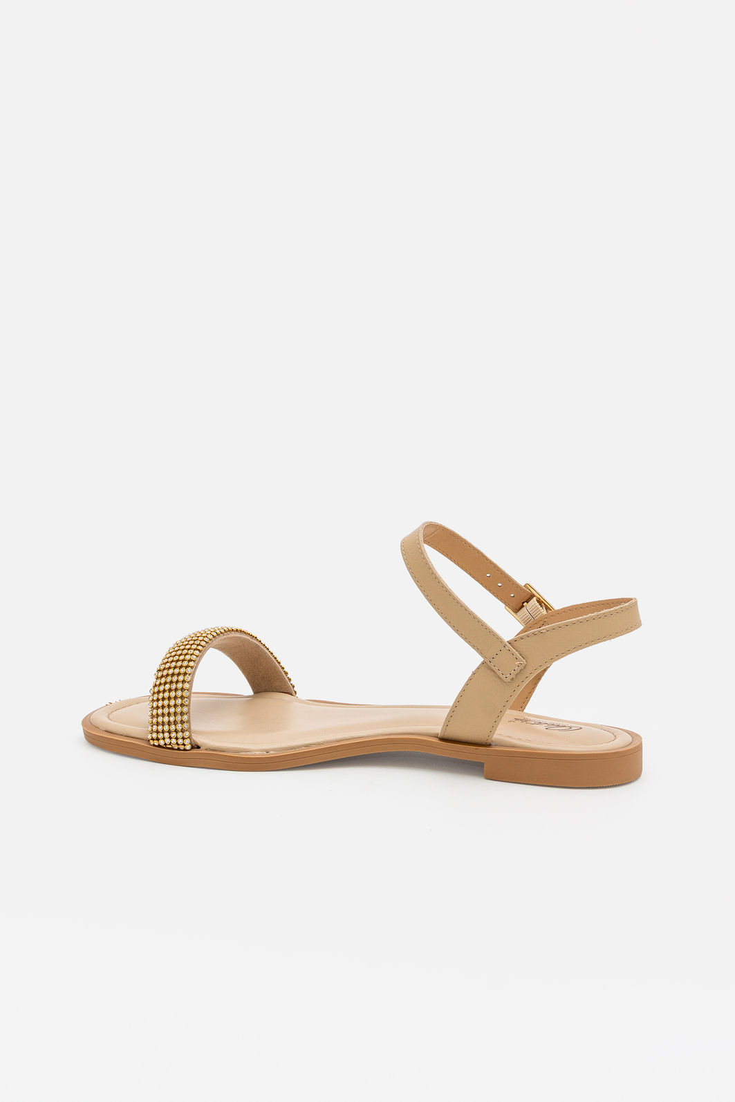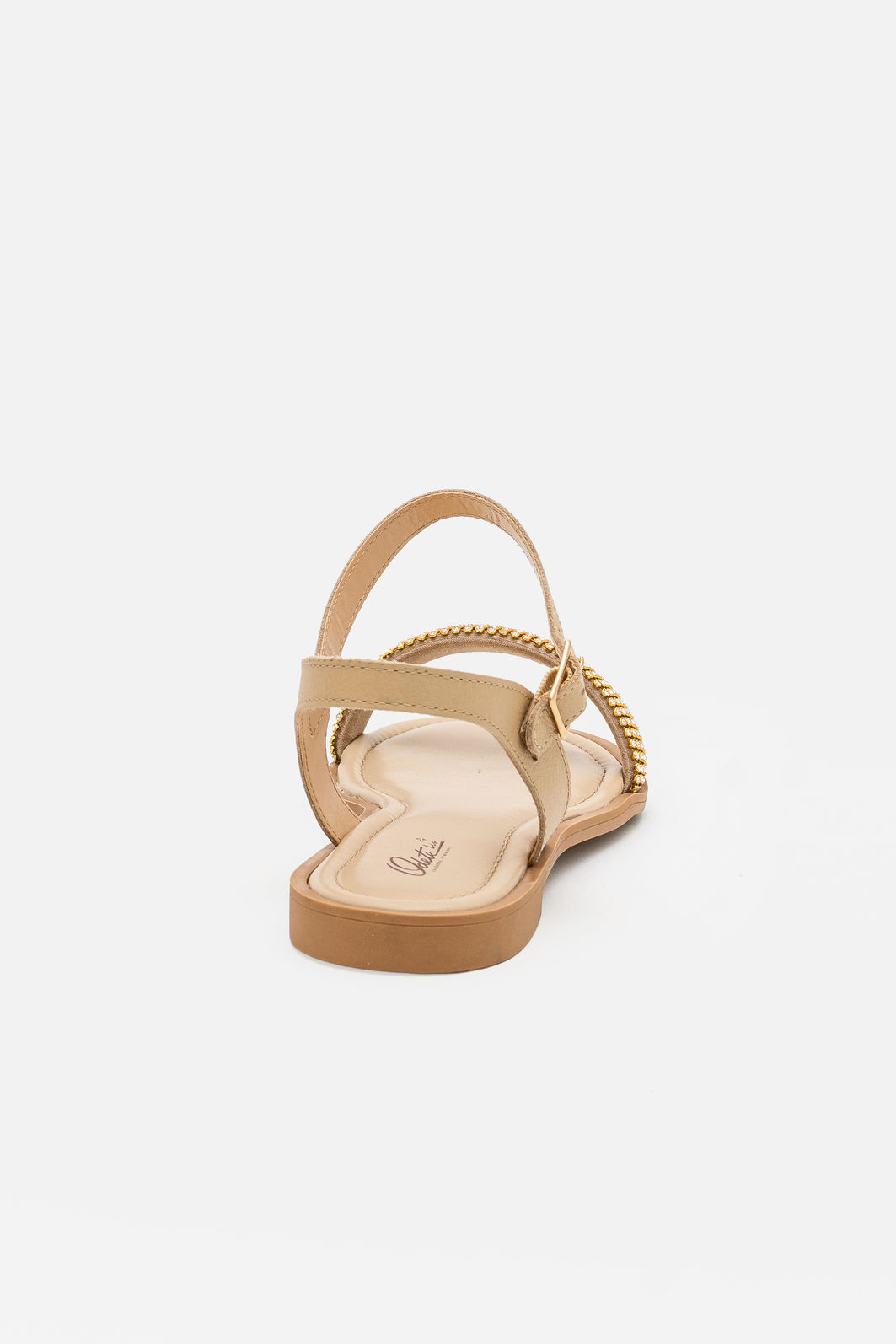 Elegante na medida certa, esta rasteira em couro na cor amêndoa combina sofisticação discreta com um toque de luminosidade. A tira frontal com aplicação de brilho valoriza o design minimalista e transforma o modelo em um destaque sutil, perfeito para quem aprecia detalhes refinados sem excessos.
