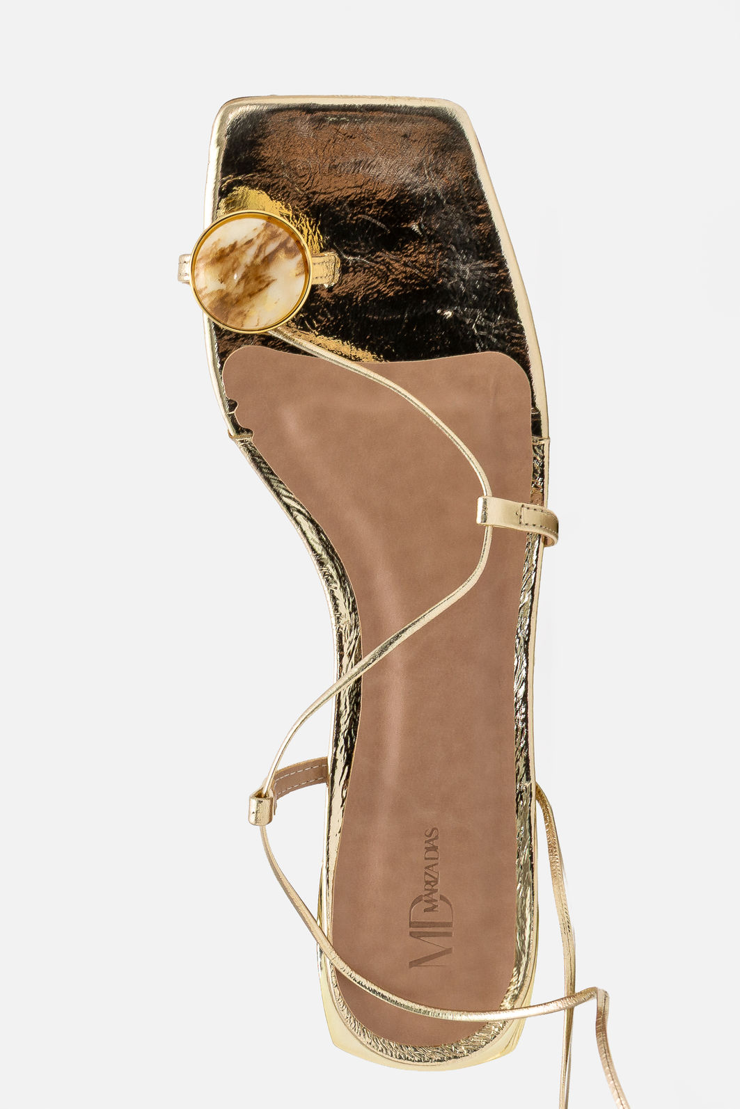 Elegante na medida certa, essa rasteira em tom ouro traduz sofisticação com leveza. O design delicado valoriza os pés por meio de tiras finas em couro metalizado, que criam um visual refinado e atual sem excessos. O destaque fica por conta da pedra natural aplicada no cabedal, um detalhe orgânico que adiciona charme exclusivo e eleva a estética do modelo.
