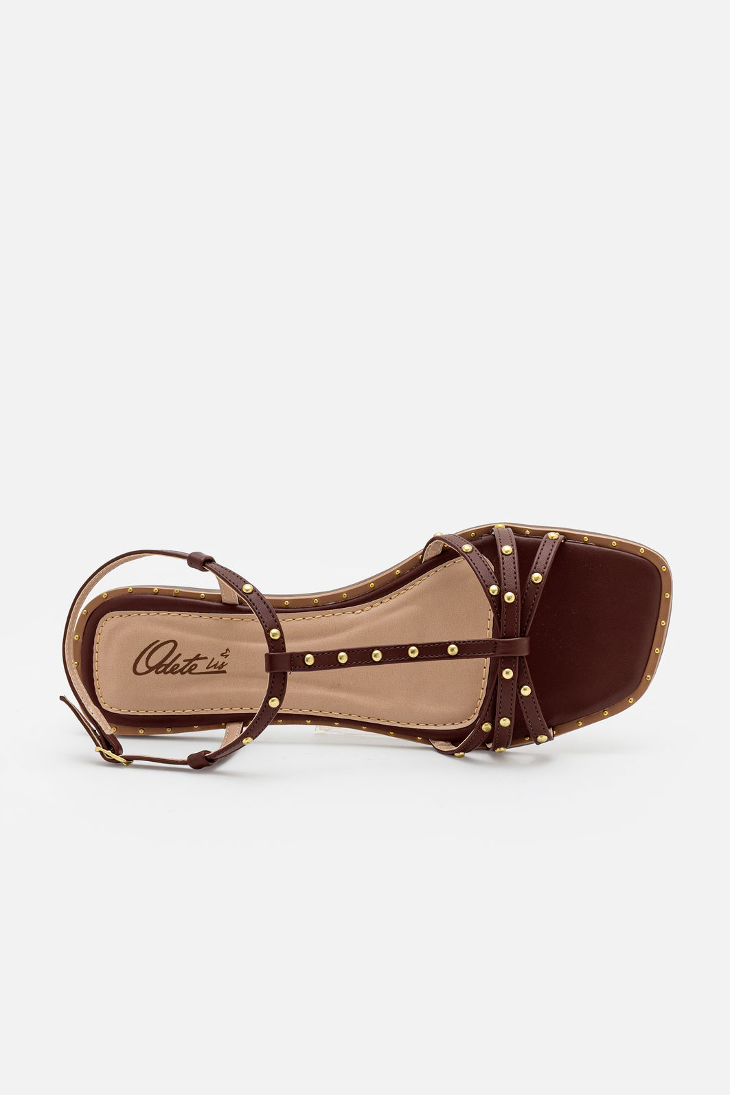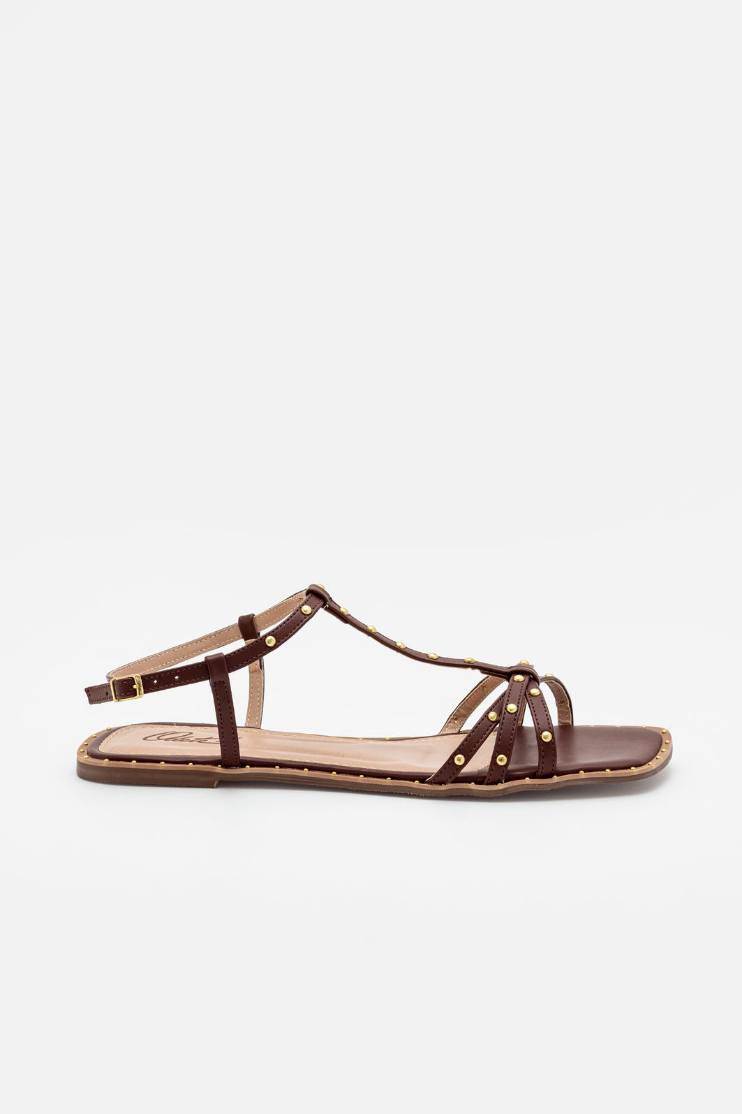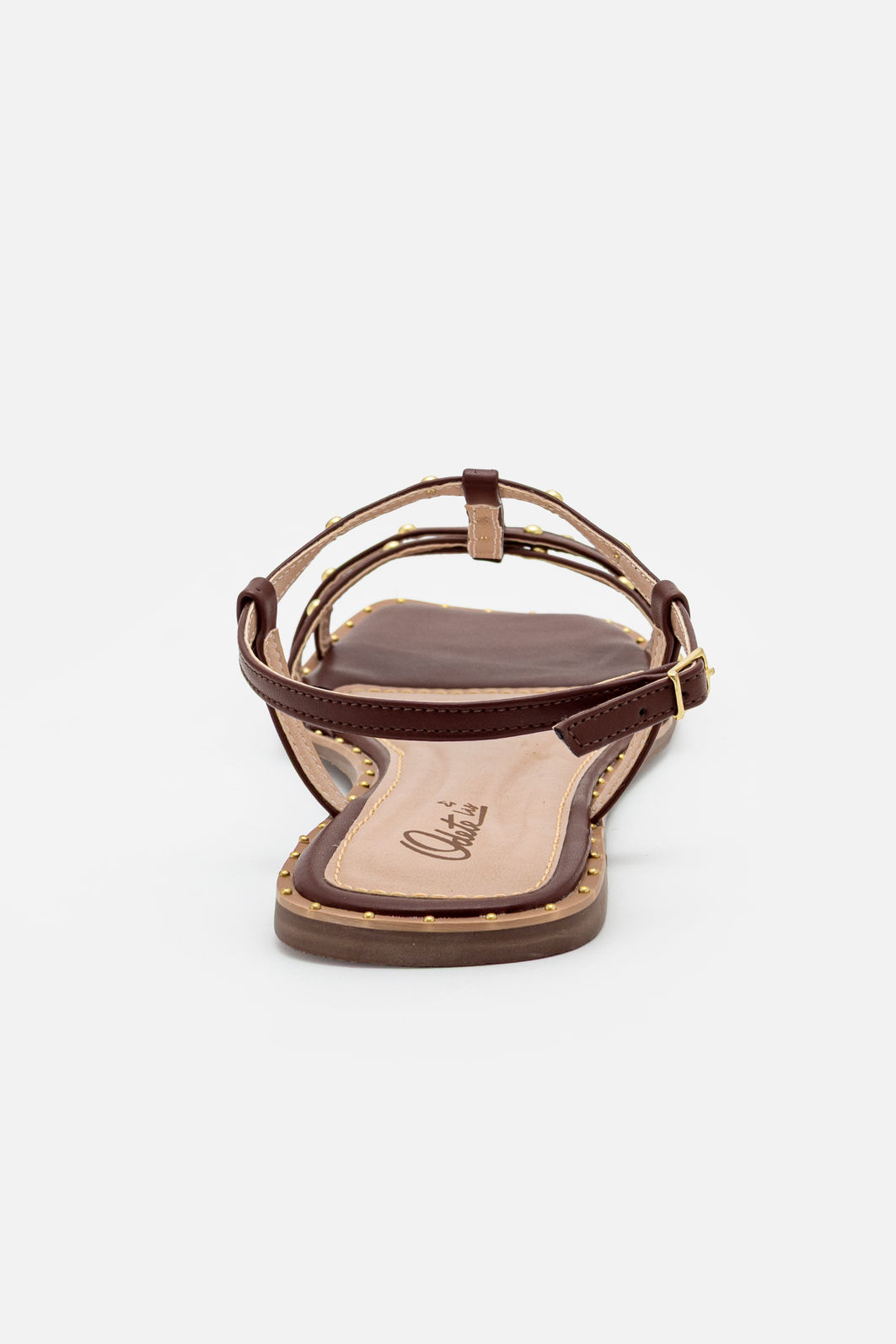 Elegância e conforto se encontram nesta rasteira que traduz o equilíbrio perfeito entre leveza e estilo. O design delicado das tiras finas é realçado pelas tachas douradas, que adicionam um toque moderno e sofisticado ao visual.