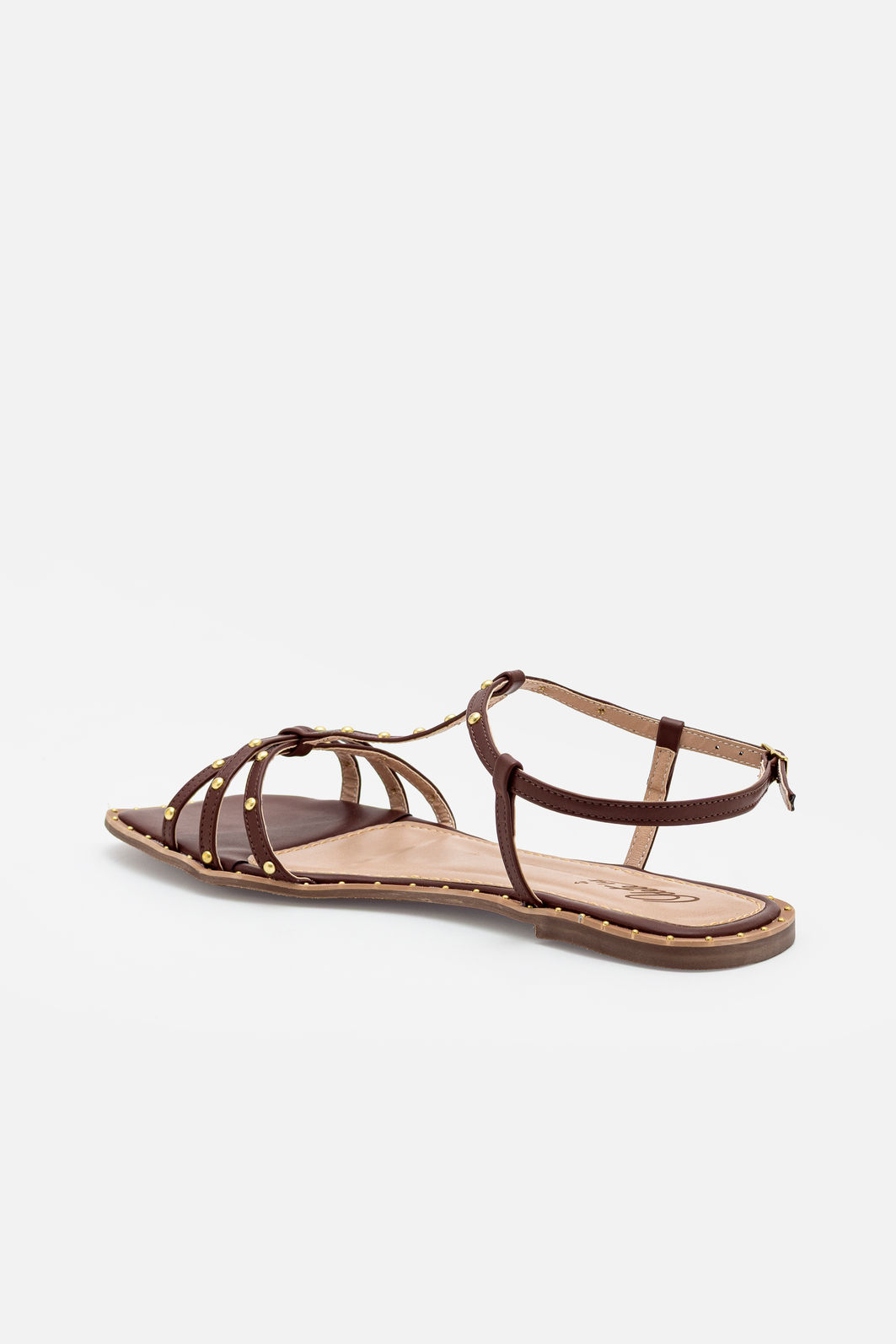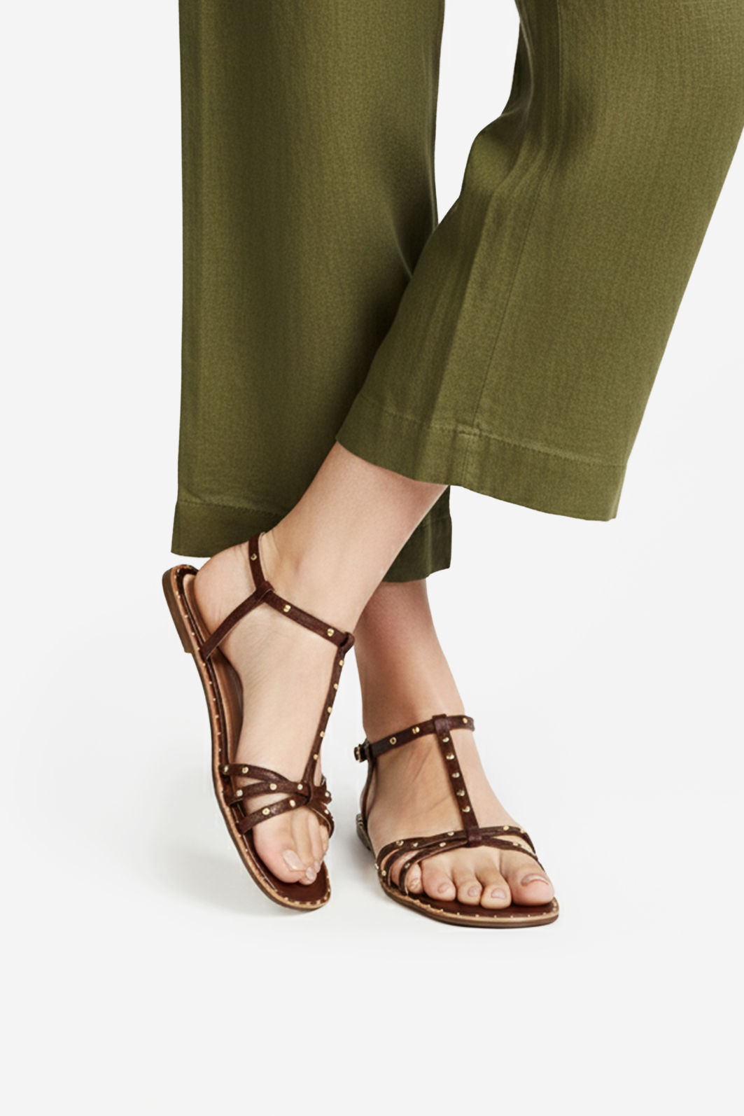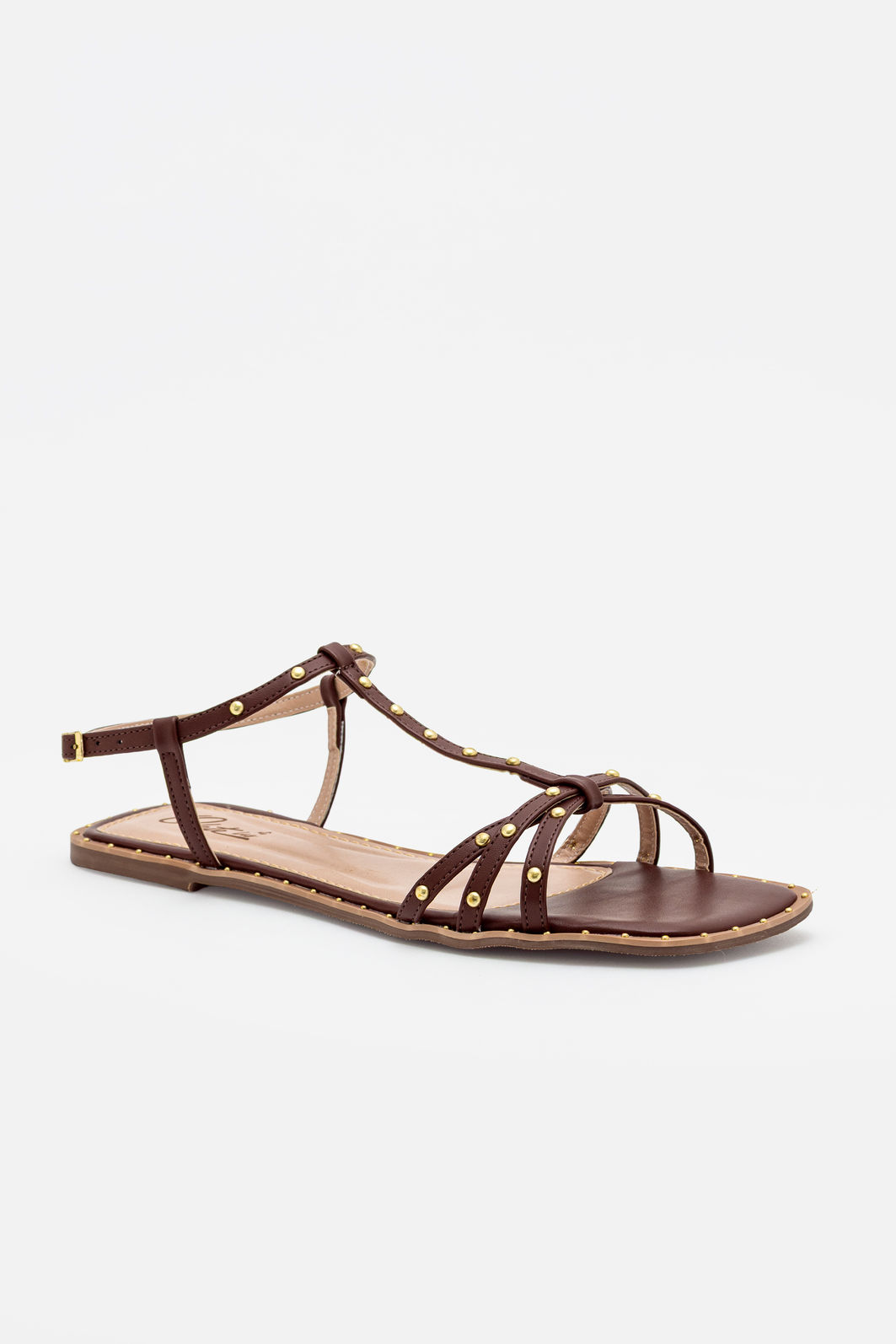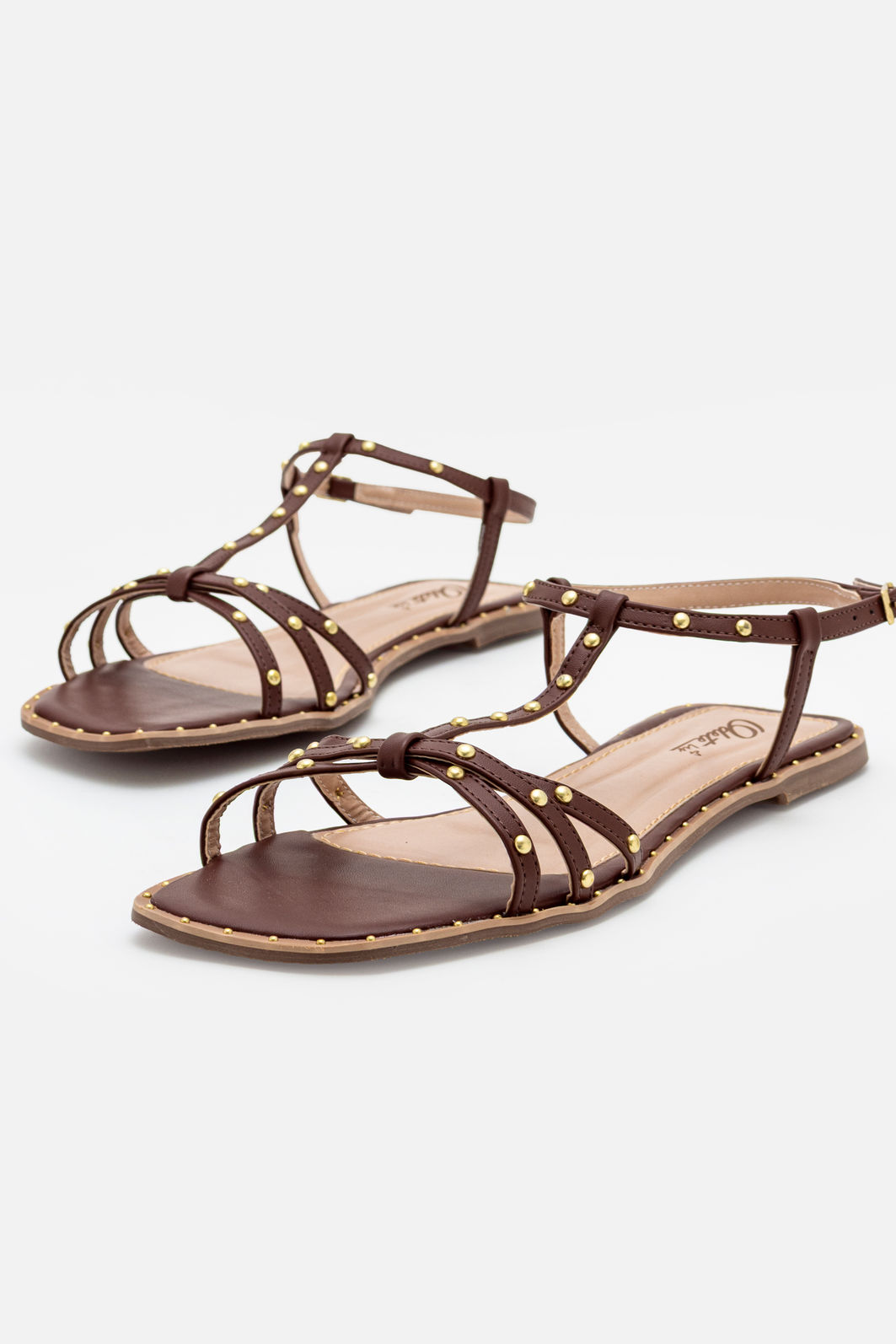 Elegância e conforto se encontram nesta rasteira que traduz o equilíbrio perfeito entre leveza e estilo. O design delicado das tiras finas é realçado pelas tachas douradas, que adicionam um toque moderno e sofisticado ao visual.