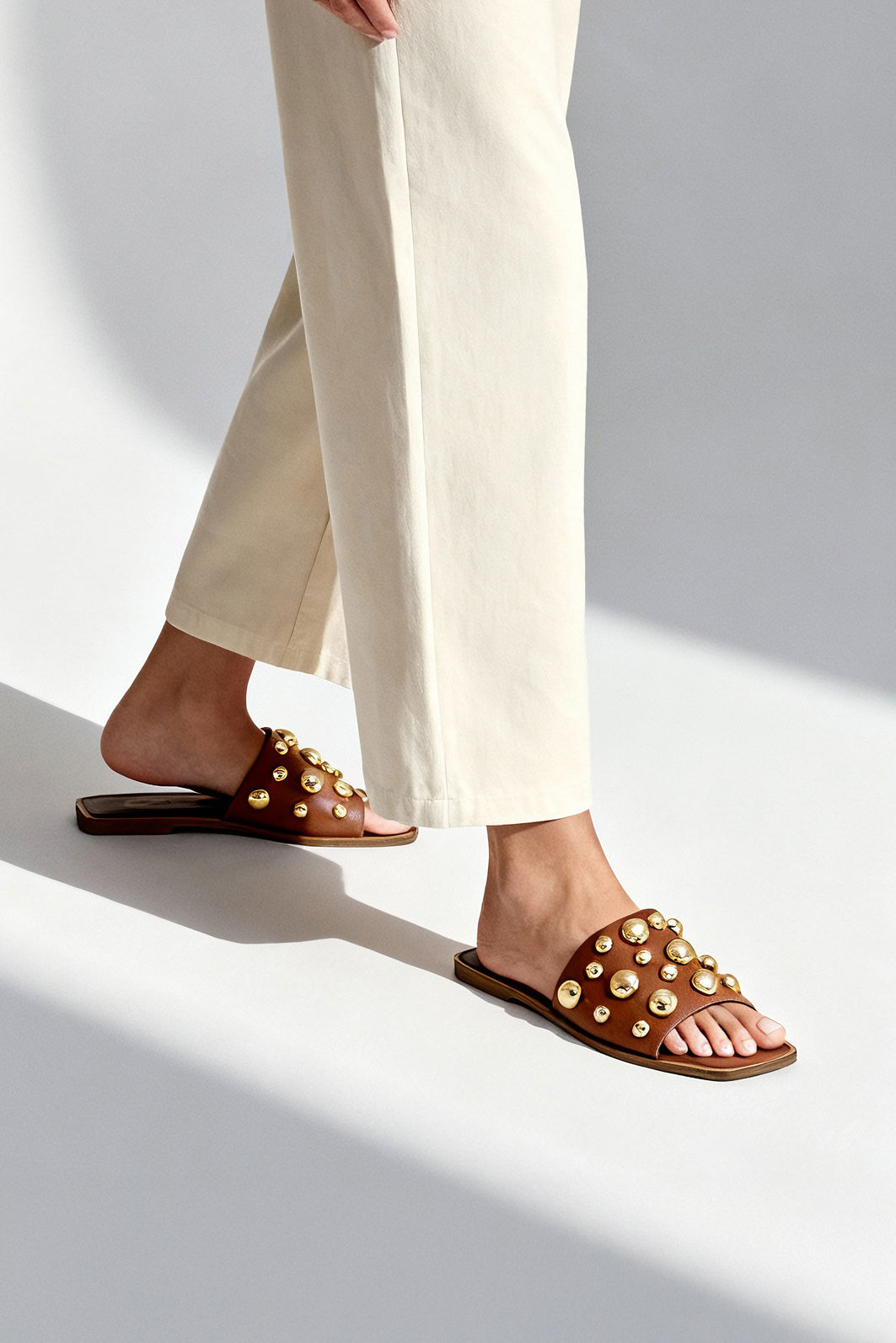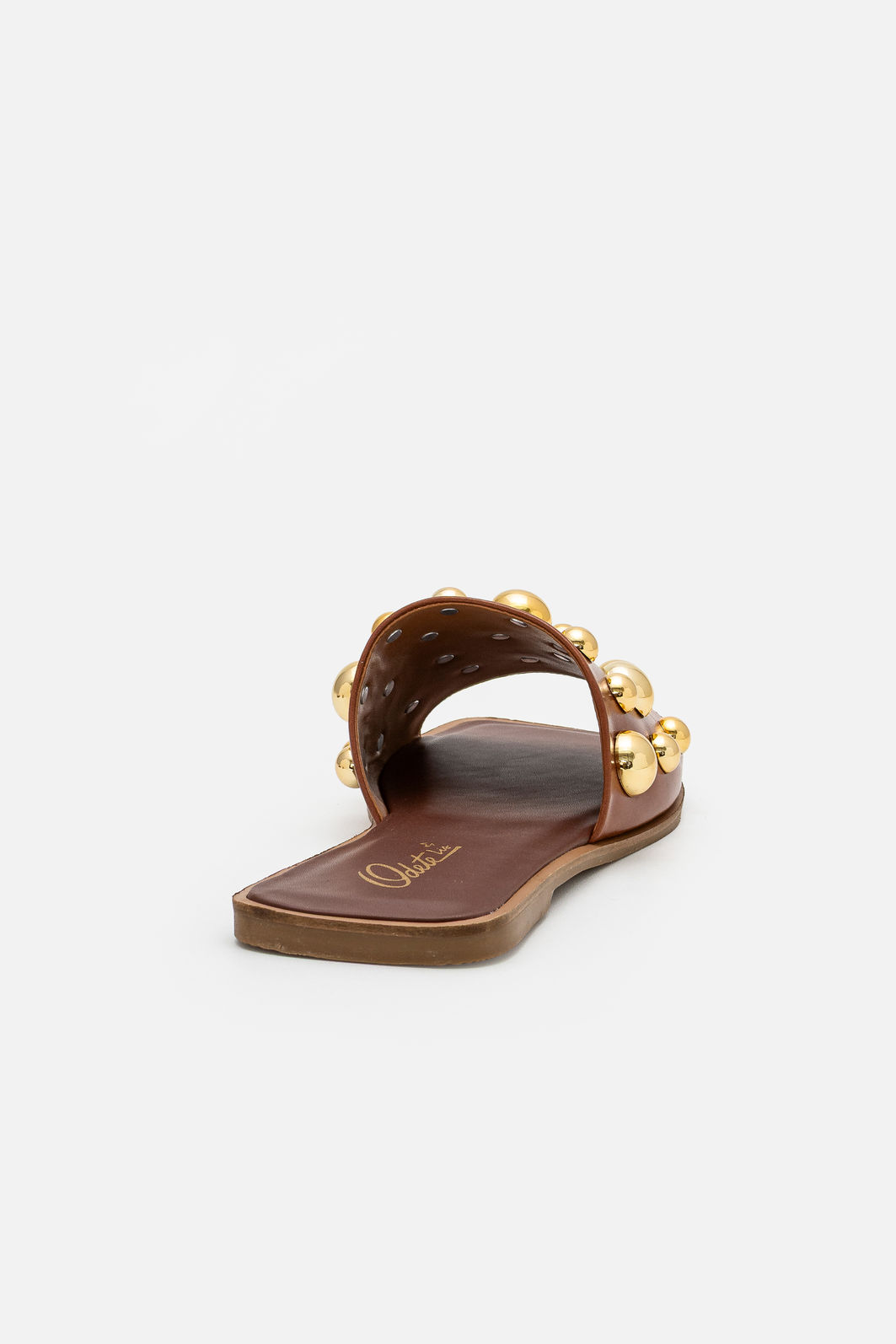 O tom tostado acrescenta sofisticação e calor à composição, tornando o modelo ainda mais versátil e atemporal. As esferas metálicas contrastam com o couro de forma equilibrada, elevando o design sem excessos. A palmilha macia garante conforto prolongado, enquanto o solado baixo oferece estabilidade e leveza para o uso diário.
