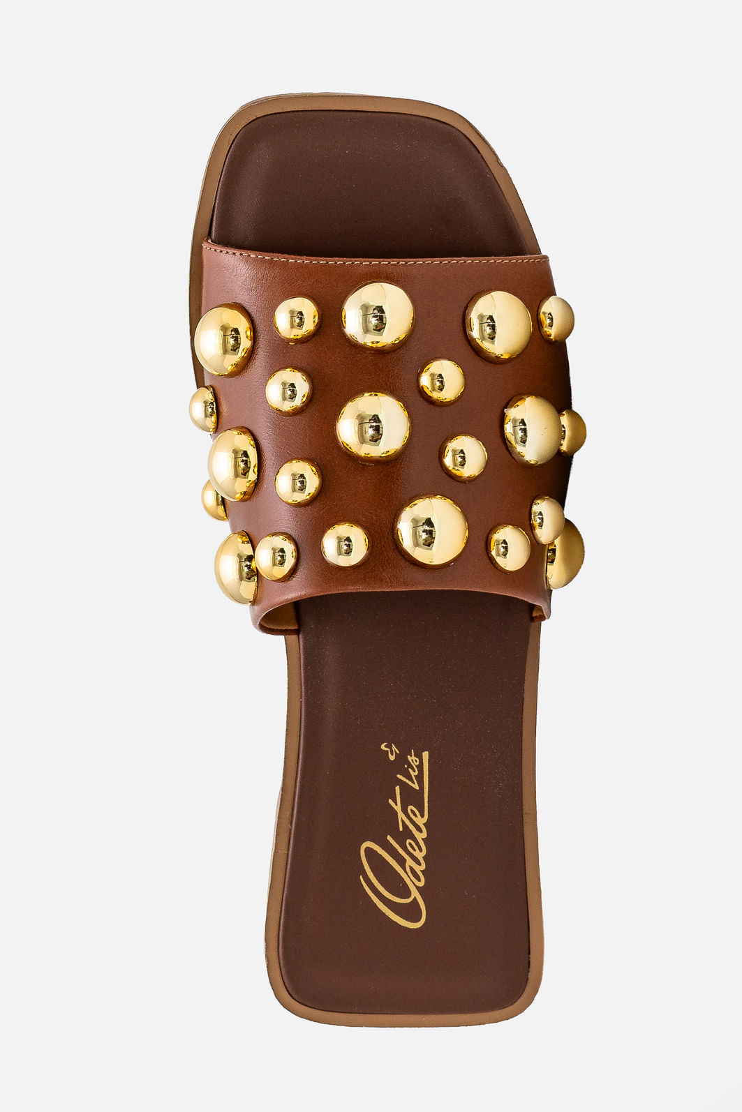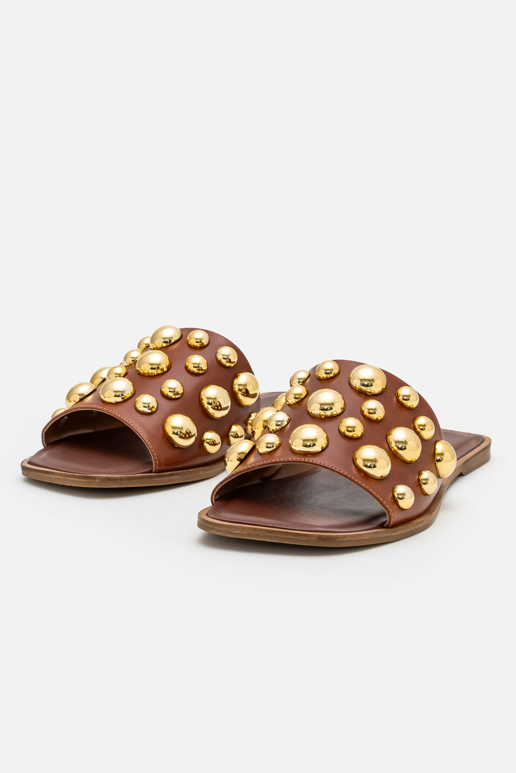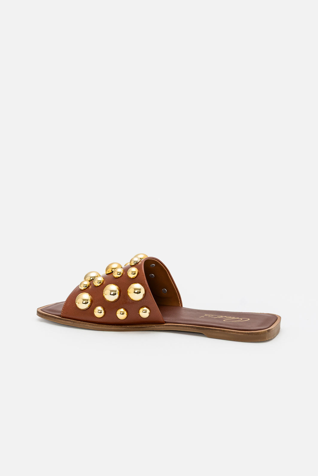 AdicionarCom estética contemporânea e acabamento sofisticado, esta rasteira em couro tostado é a escolha ideal para mulheres que valorizam estilo marcante aliado ao conforto. O cabedal em couro legítimo recebe aplicação de esferas cromadas douradas em diferentes tamanhos, criando um visual moderno, elegante e cheio de personalidade.