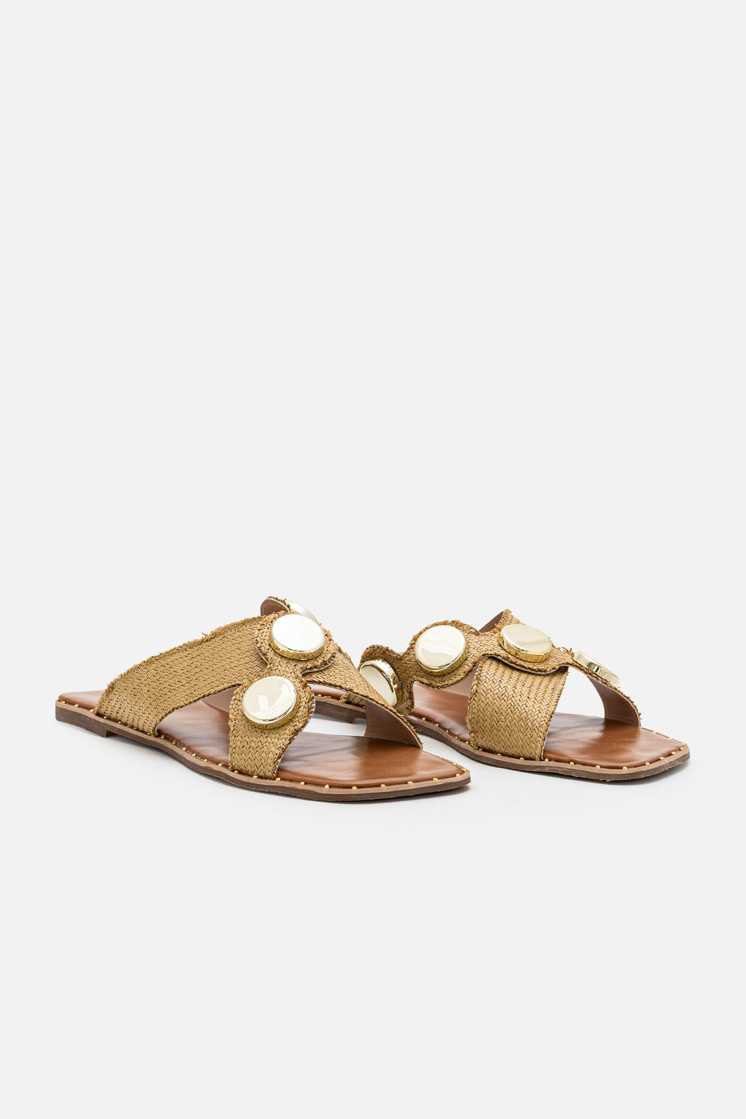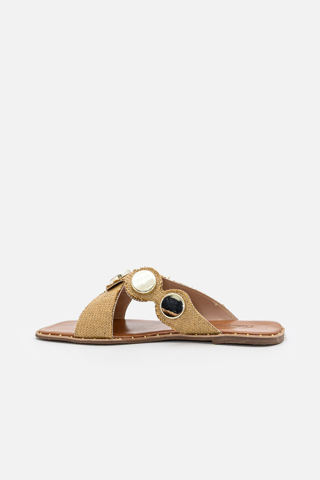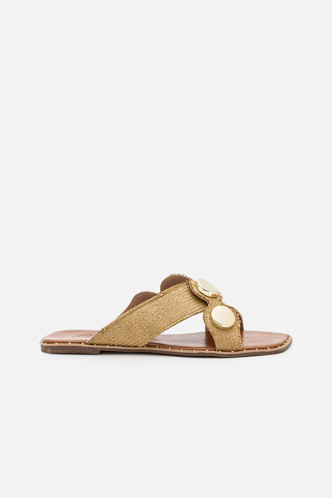 Esta rasteira em ráfia combina naturalidade, sofisticação e conforto em um design atual e extremamente elegante. As tiras cruzadas valorizam o pé e criam um visual equilibrado, enquanto os enfeites metálicos acrescentam um toque de brilho refinado, elevando a estética do modelo.