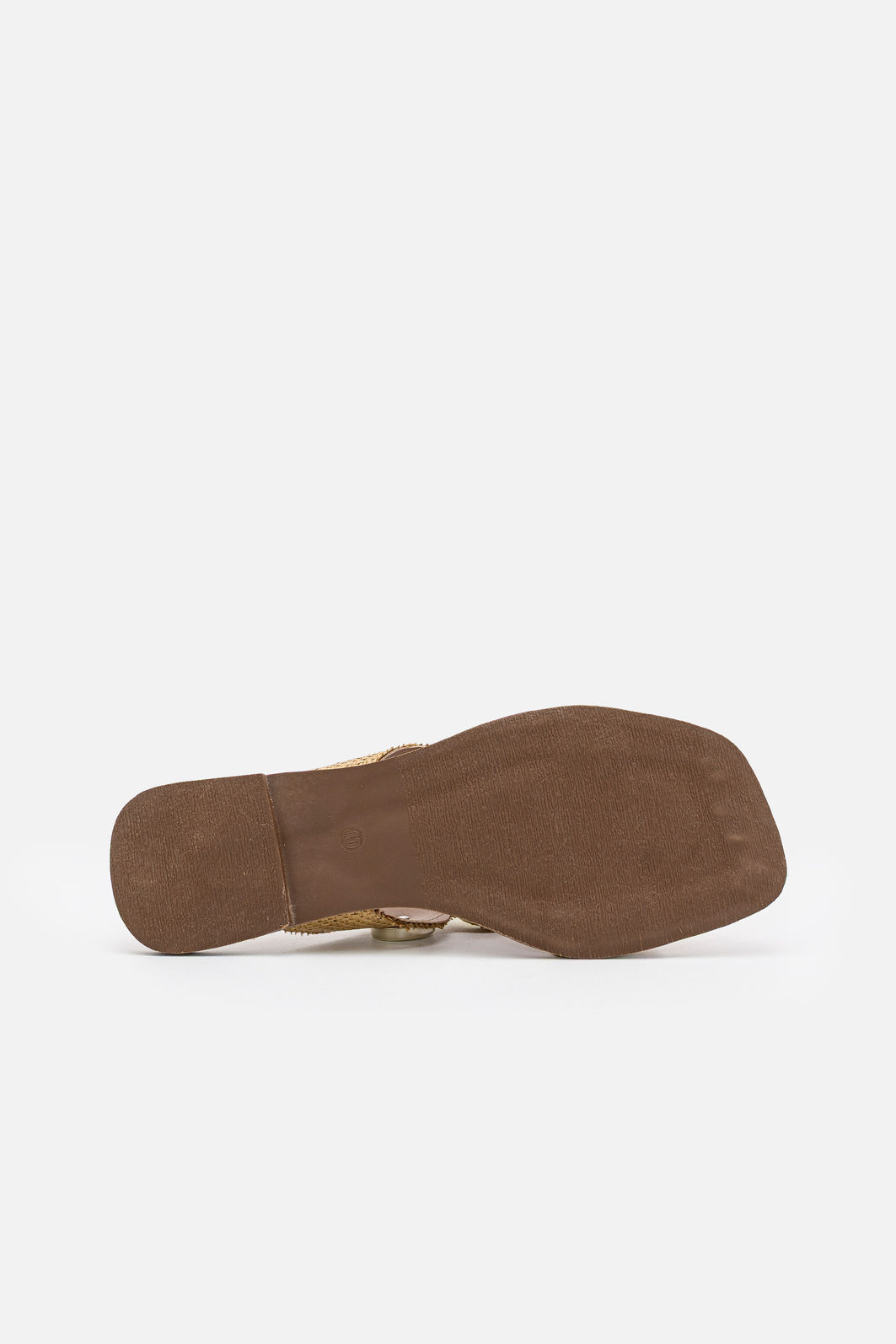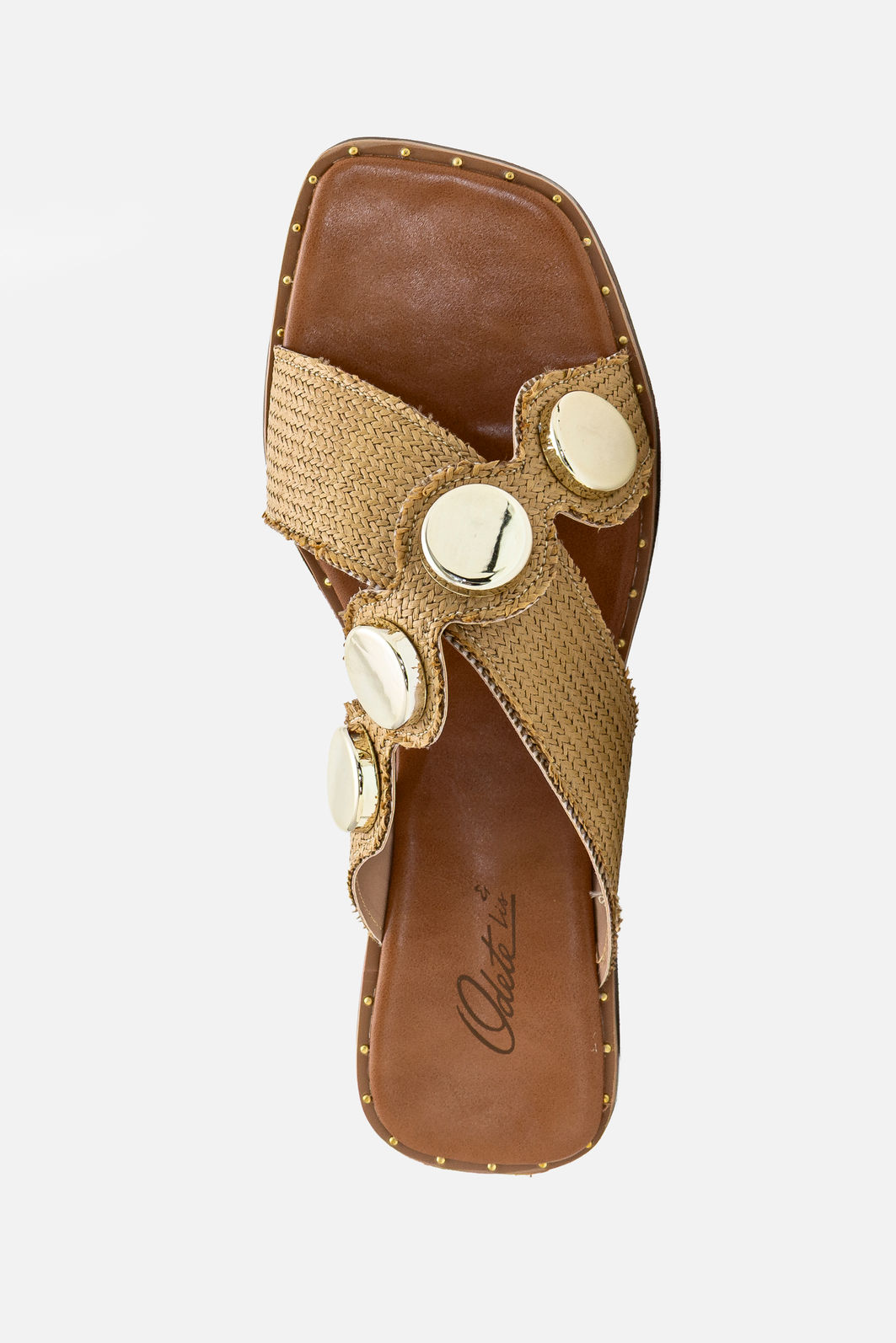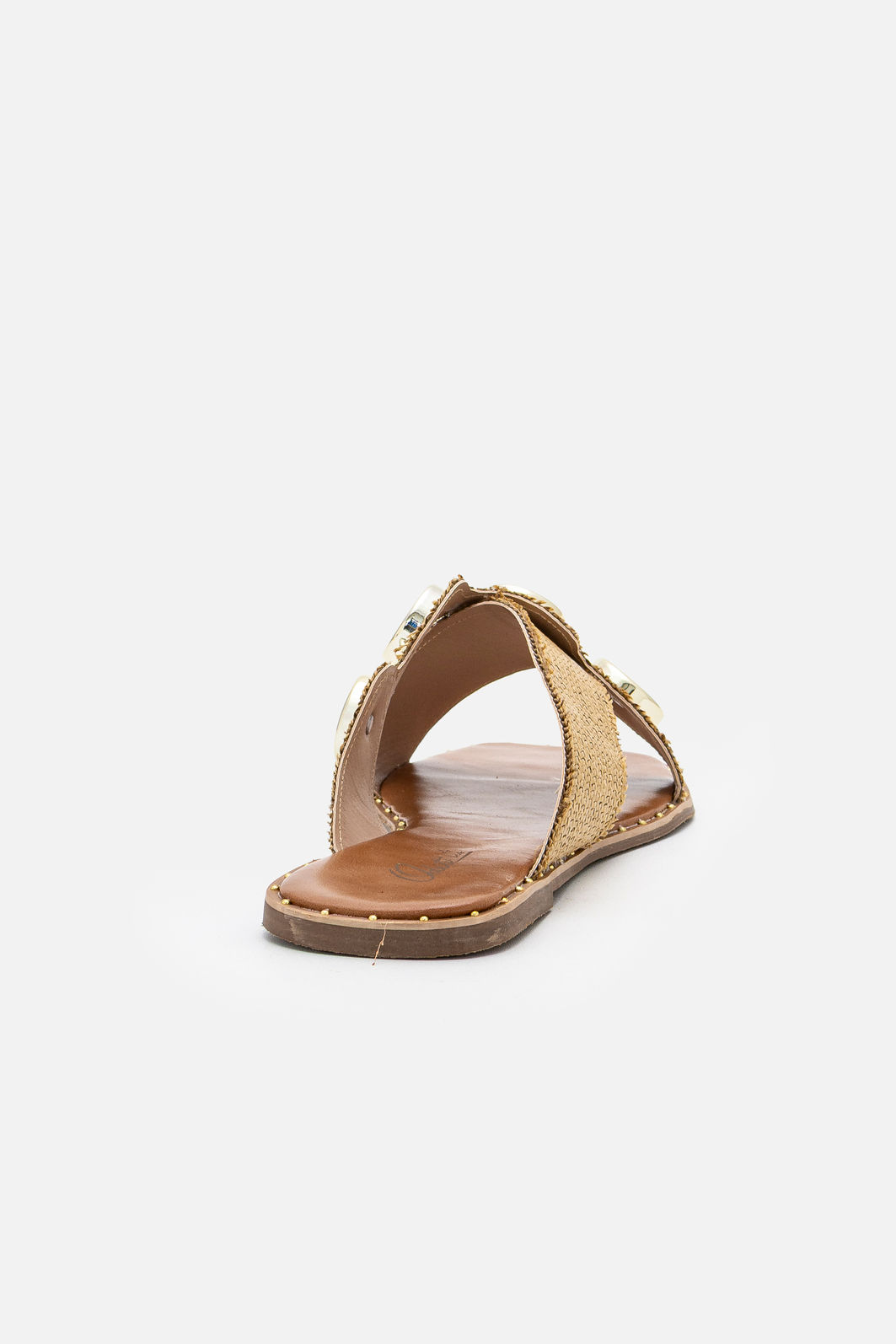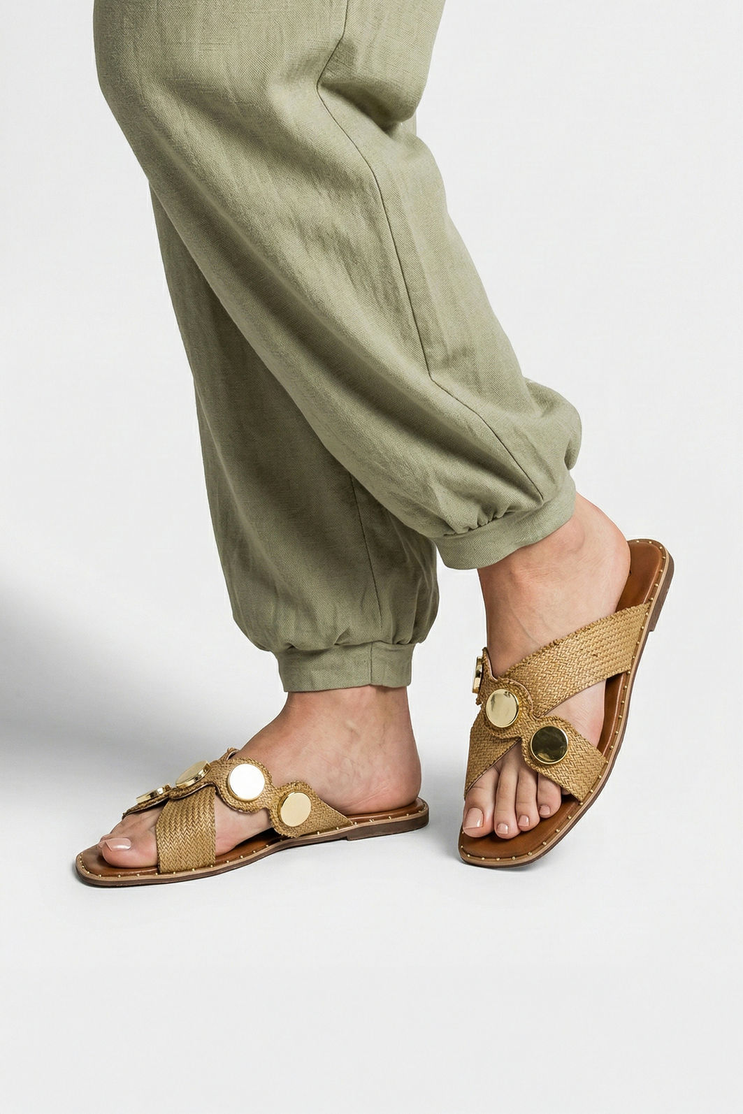 Esta rasteira em ráfia combina naturalidade, sofisticação e conforto em um design atual e extremamente elegante. As tiras cruzadas valorizam o pé e criam um visual equilibrado, enquanto os enfeites metálicos acrescentam um toque de brilho refinado, elevando a estética do modelo.