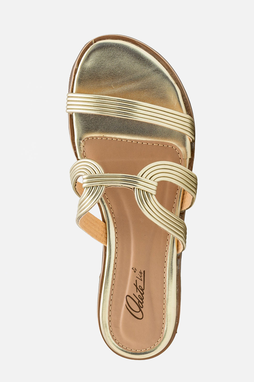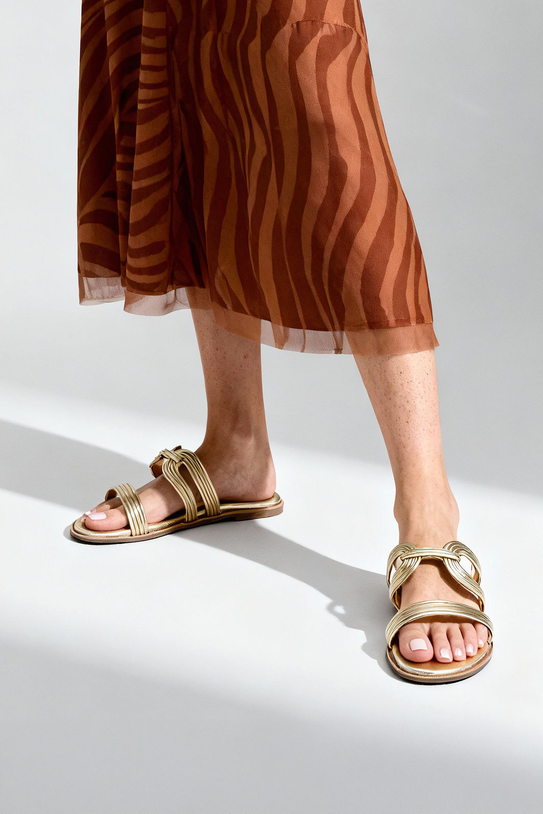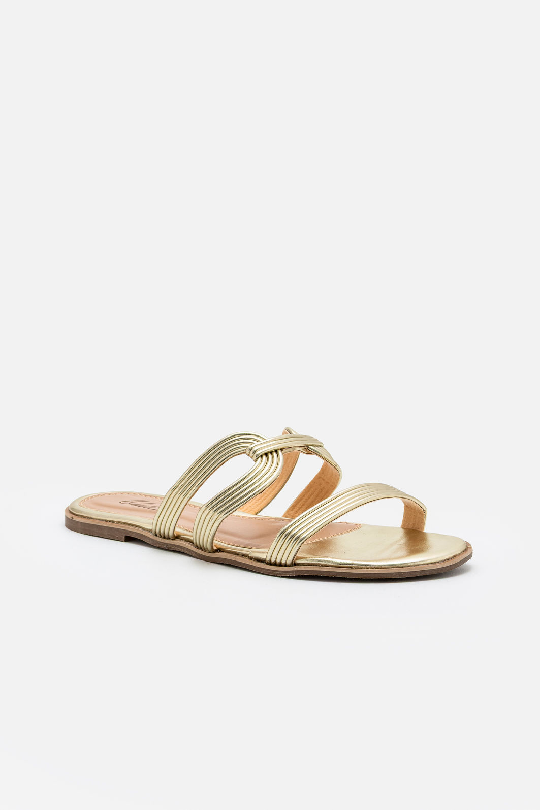 A Rasteira em Material Metalizado Champagne combina leveza, brilho sofisticado e acabamento impecável em um design que valoriza o pé com elegância. As tiras finas criam um traçado delicado e contemporâneo, enquanto o detalhe central entrelaçado adiciona personalidade sutil ao visual.
