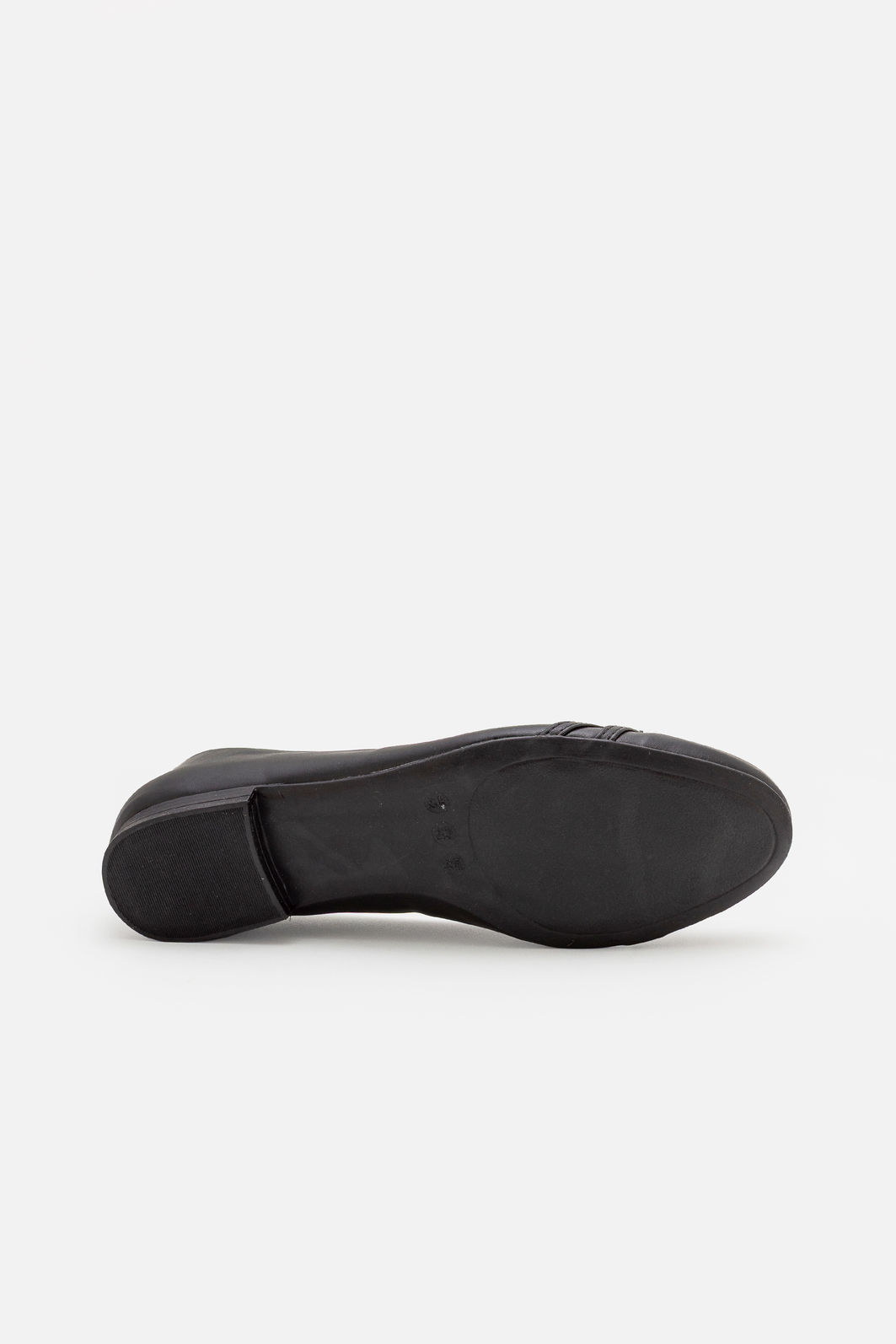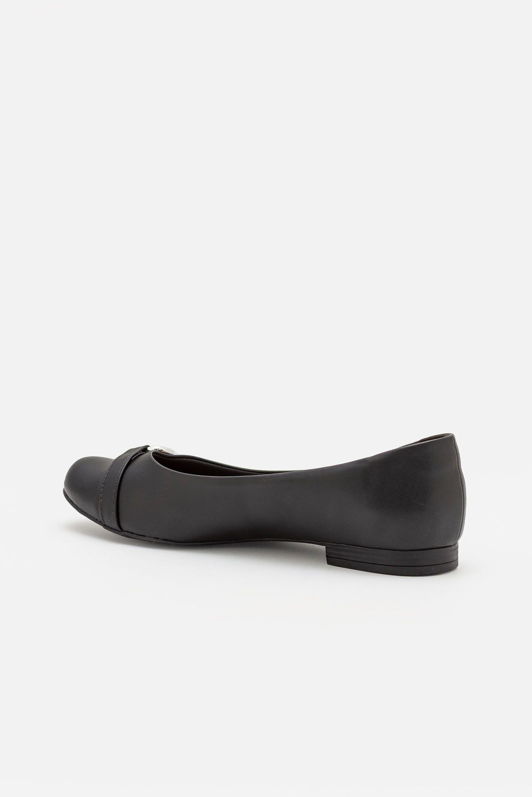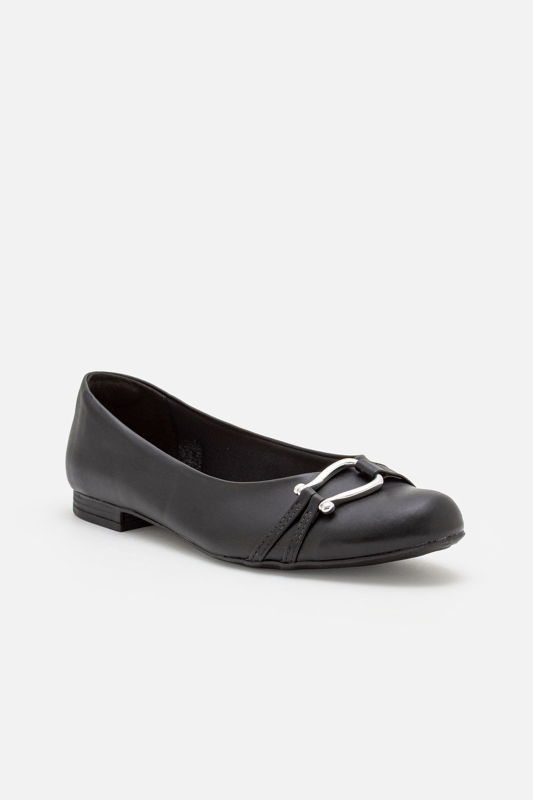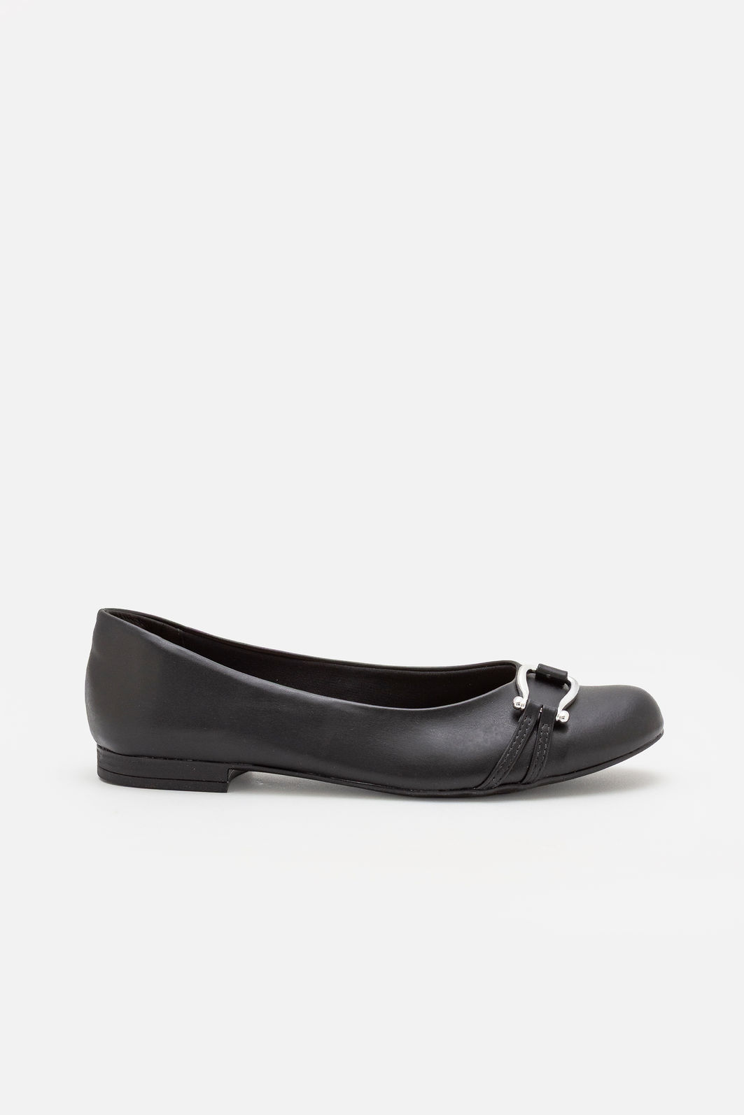 A Sapatilha com Bico Redondo e Enfeite Metálico Preta é a escolha ideal para quem valoriza elegância e conforto em um único calçado. Seu design clássico ganha destaque com o delicado detalhe metálico na parte frontal, que adiciona um toque moderno e refinado à produção.