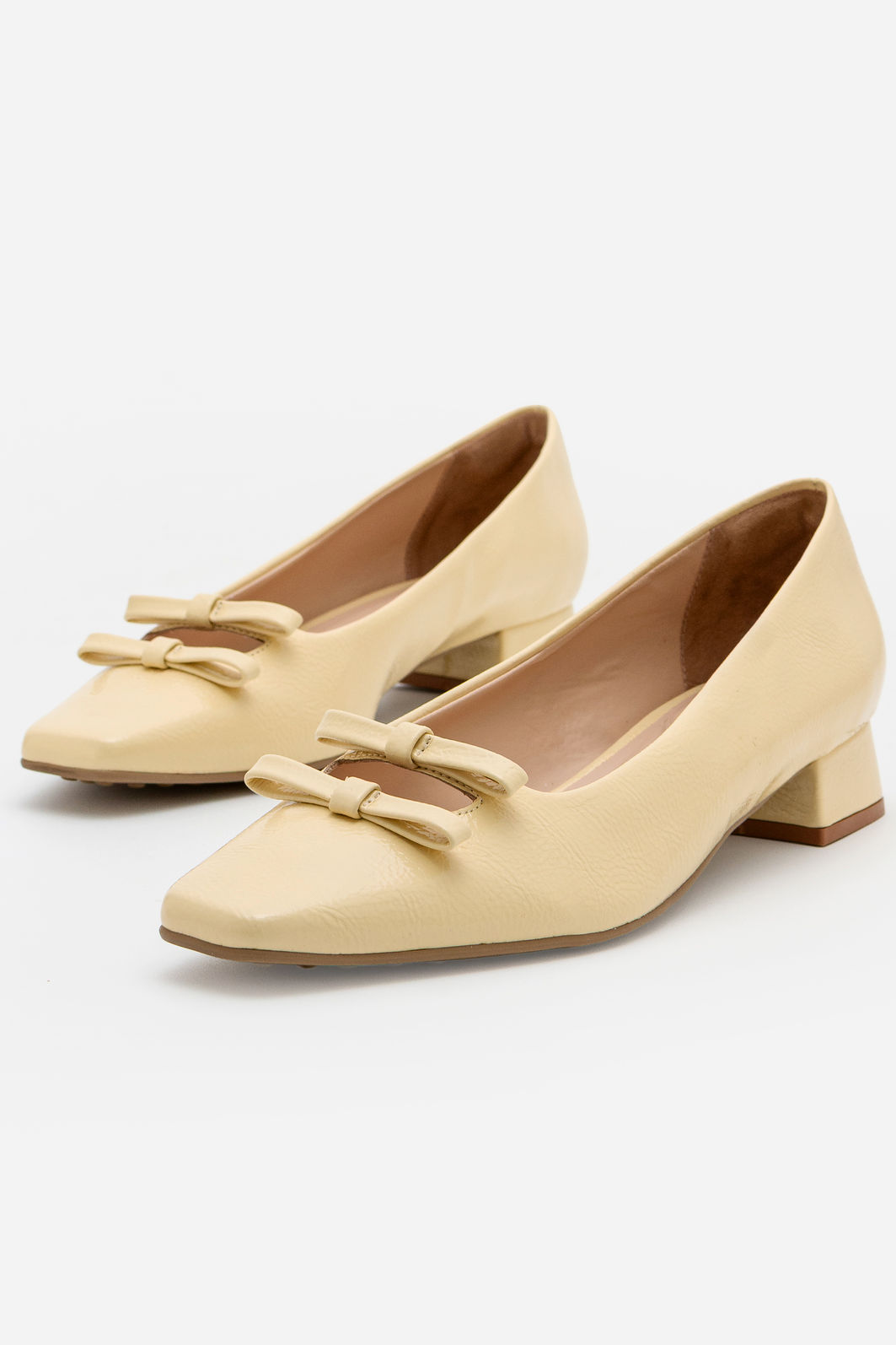 Delicado e cheio de charme, o scarpin com lacinhos e bico quadrado amarelo claro é a escolha ideal para quem busca um toque feminino e elegante em cada detalhe. O design atemporal ganha destaque com o acabamento liso e os dois laços aplicados na parte frontal, que trazem um ar romântico e sofisticado à produção.